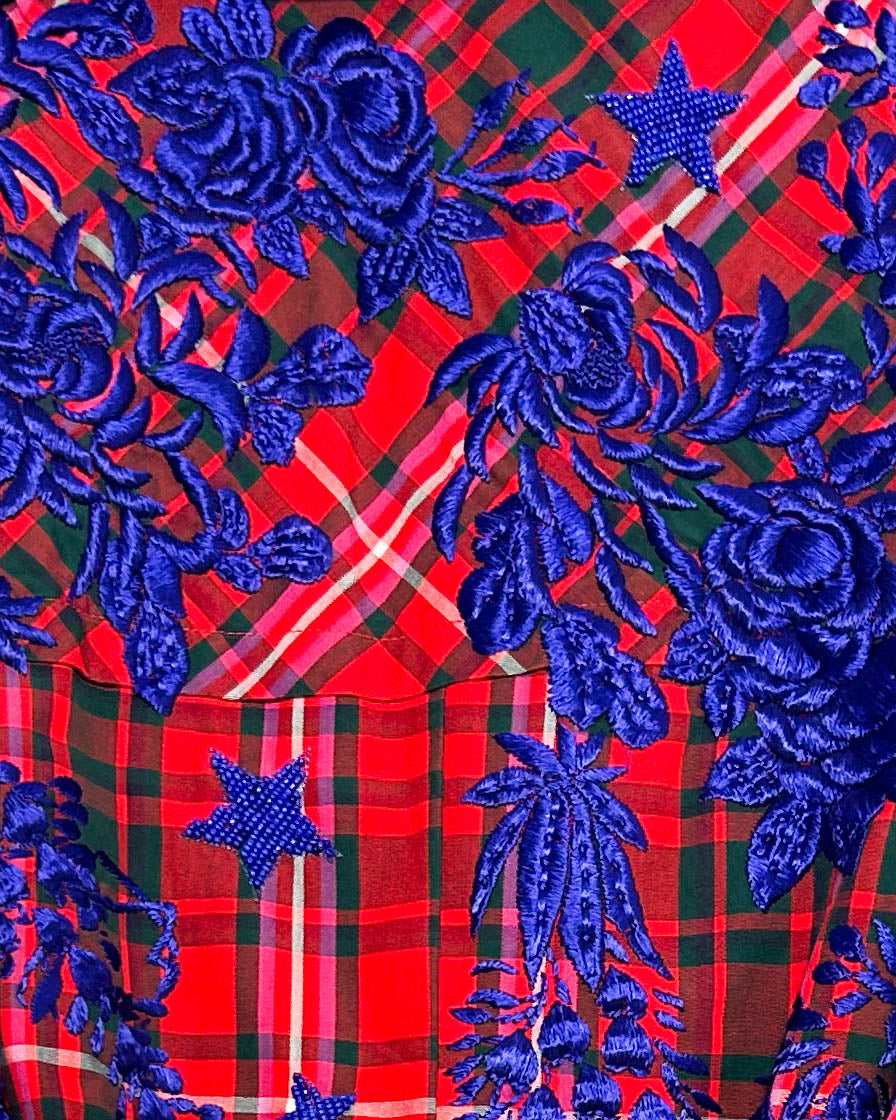 1970’s rescued, repaired and re-worked plaid cotton trench coat. Bias patch pockets and self belt, with contrast hand embroidered “wisteria “ design on the back.