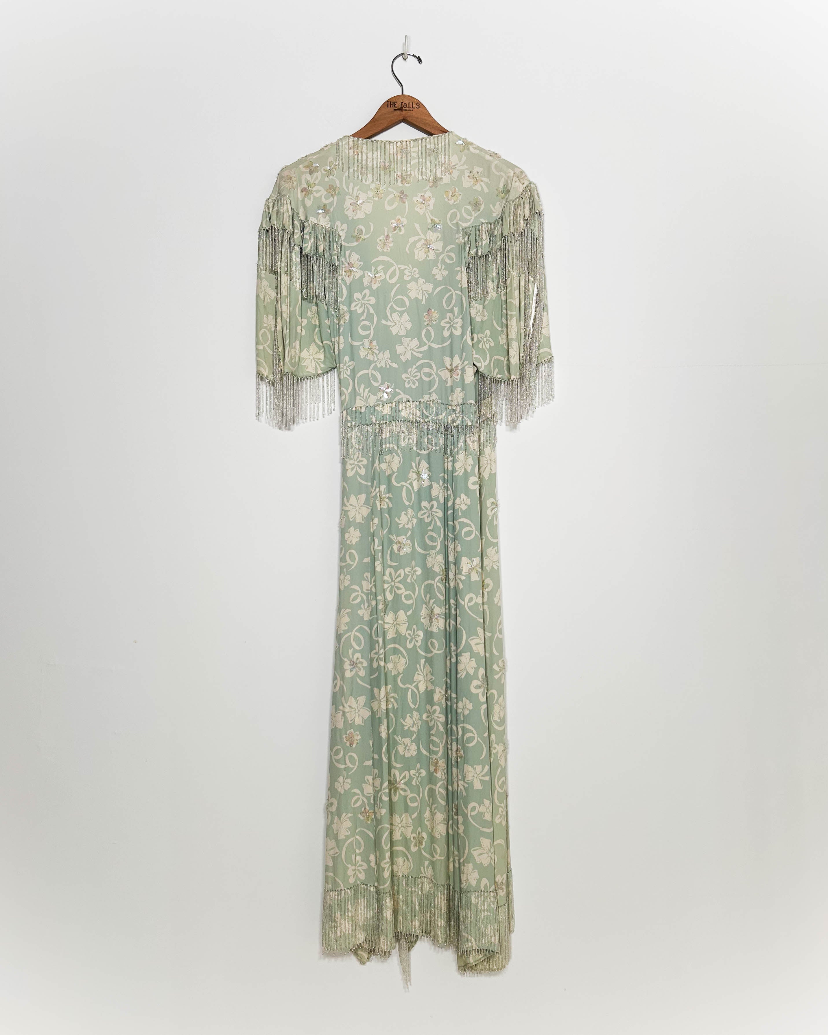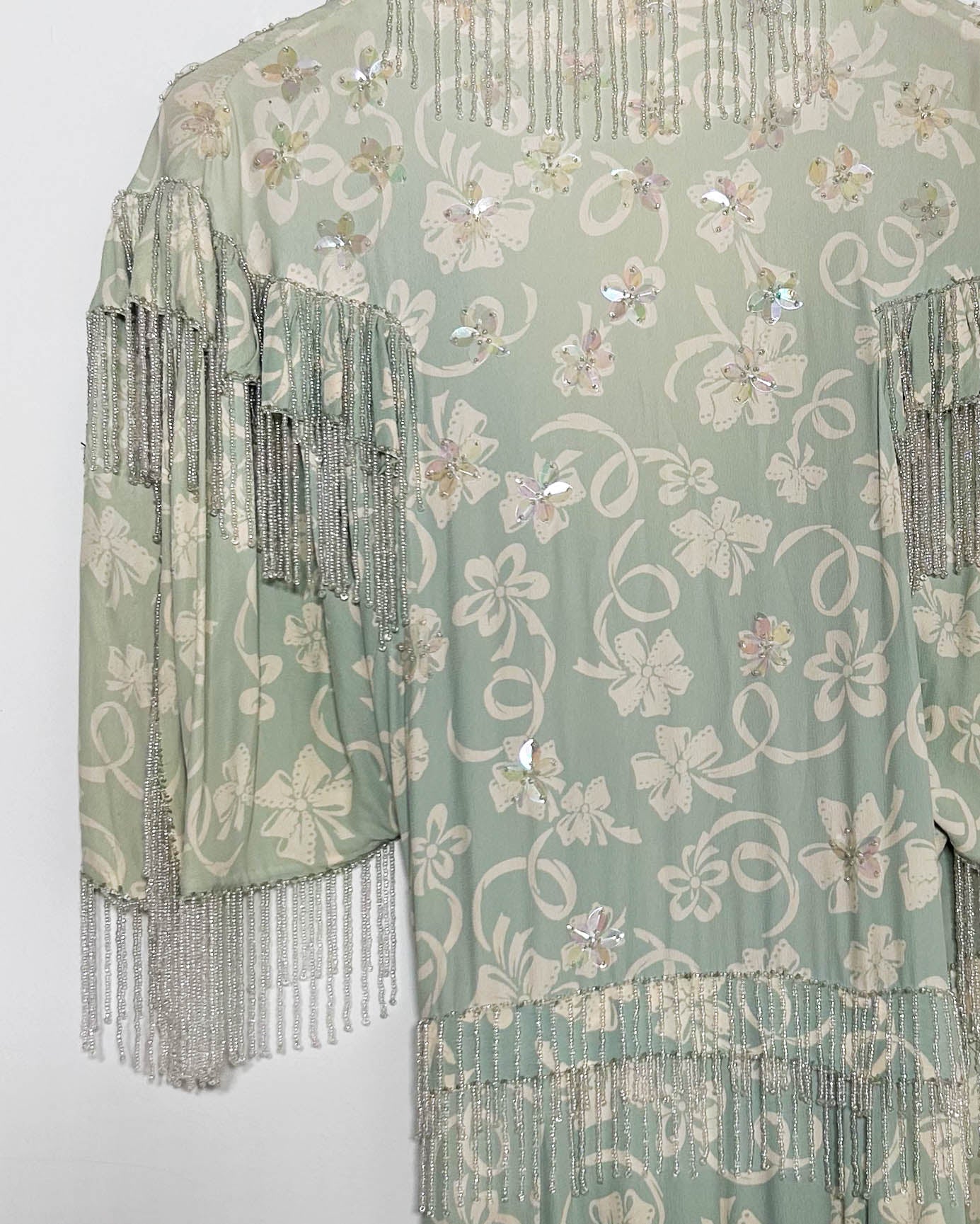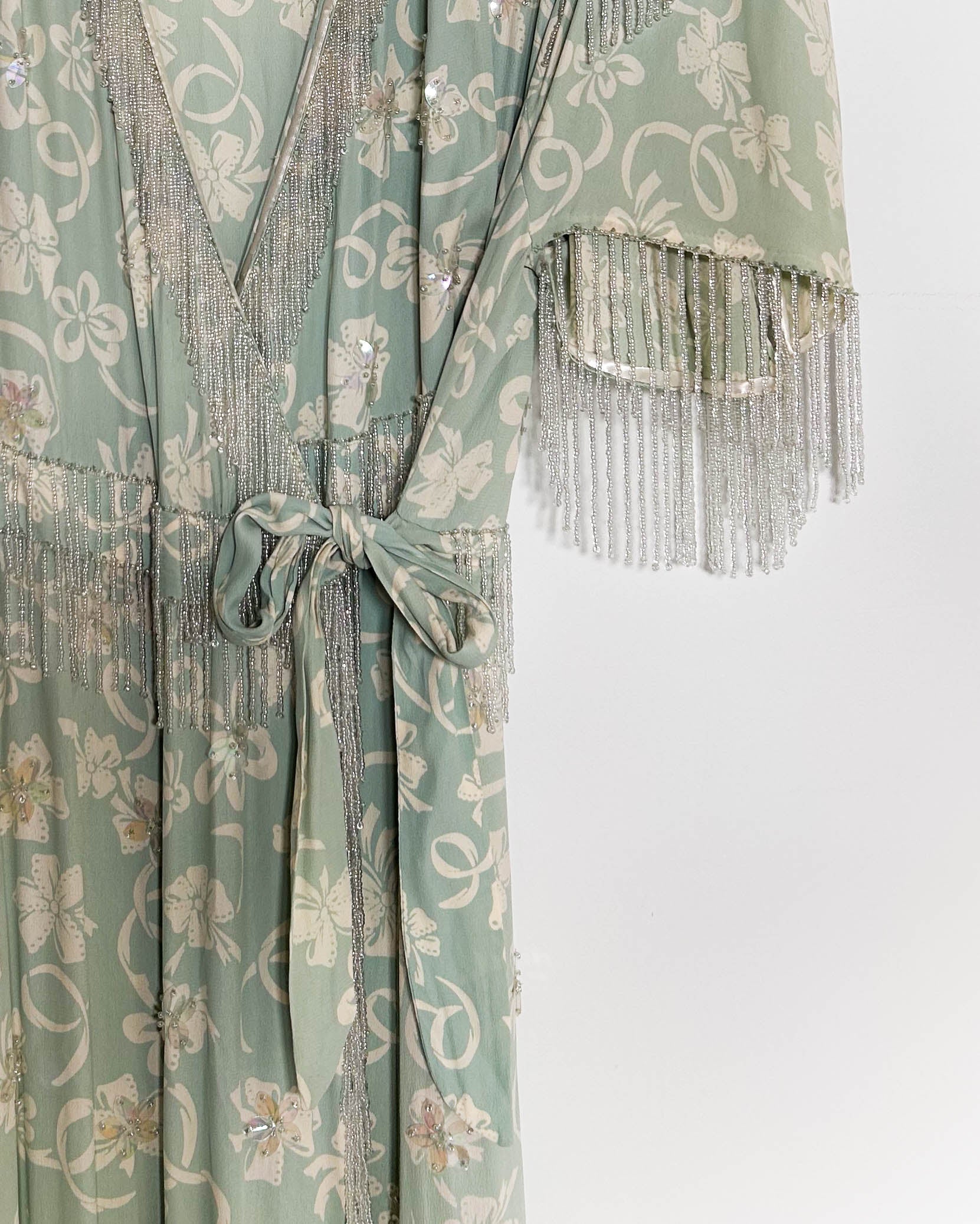 ”Ribbon Bow Print “ 1940's self belt wrap dress with long seed beaded fringe