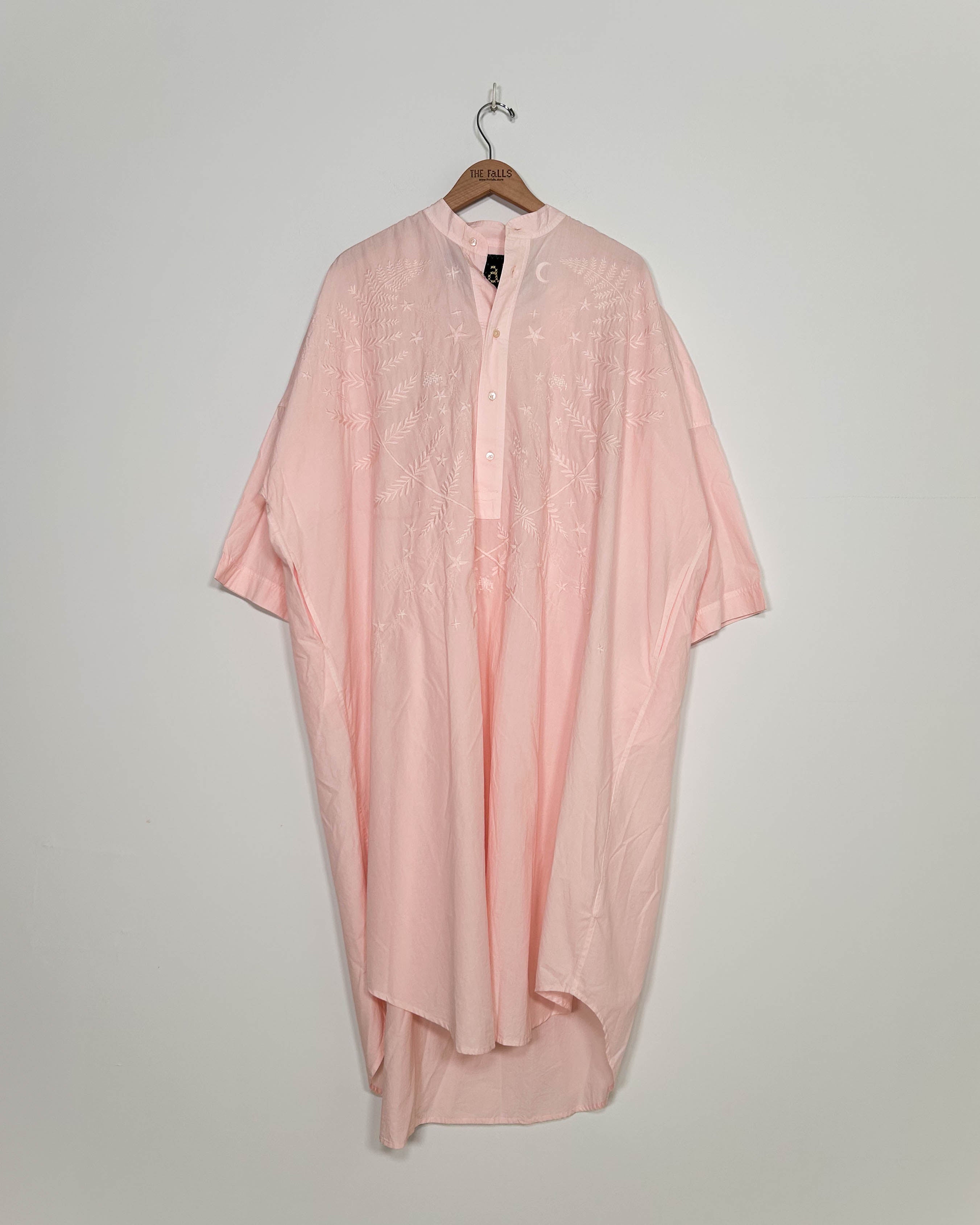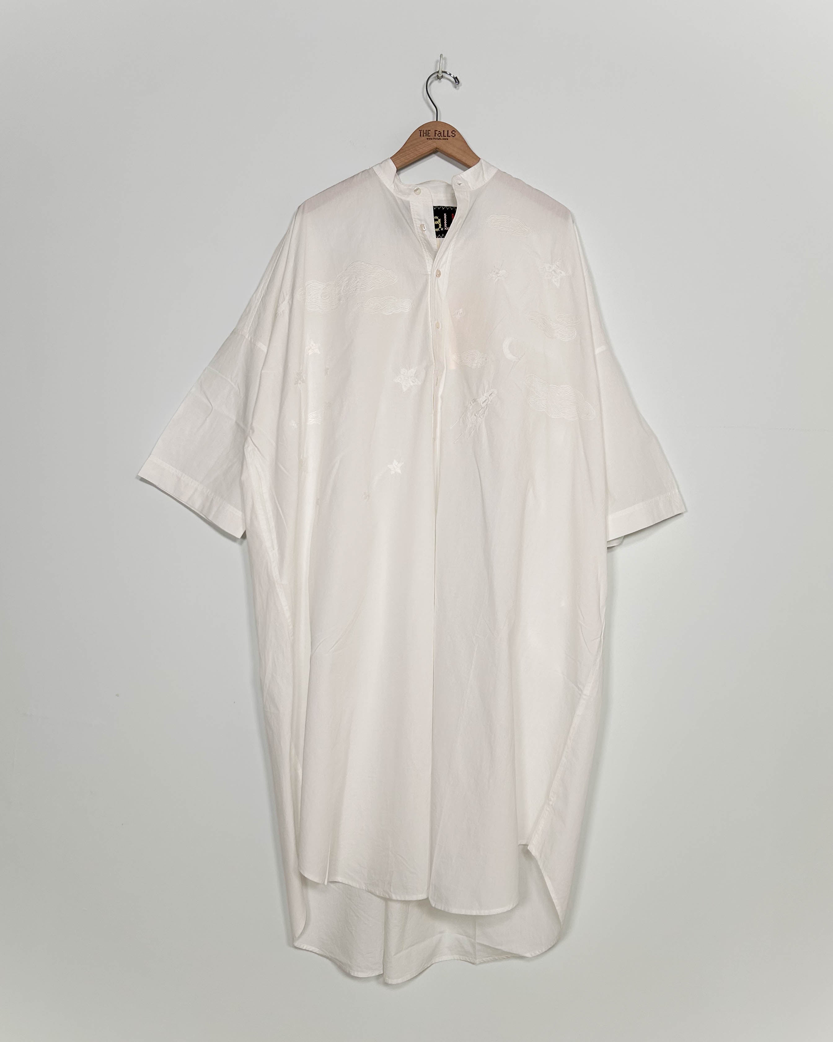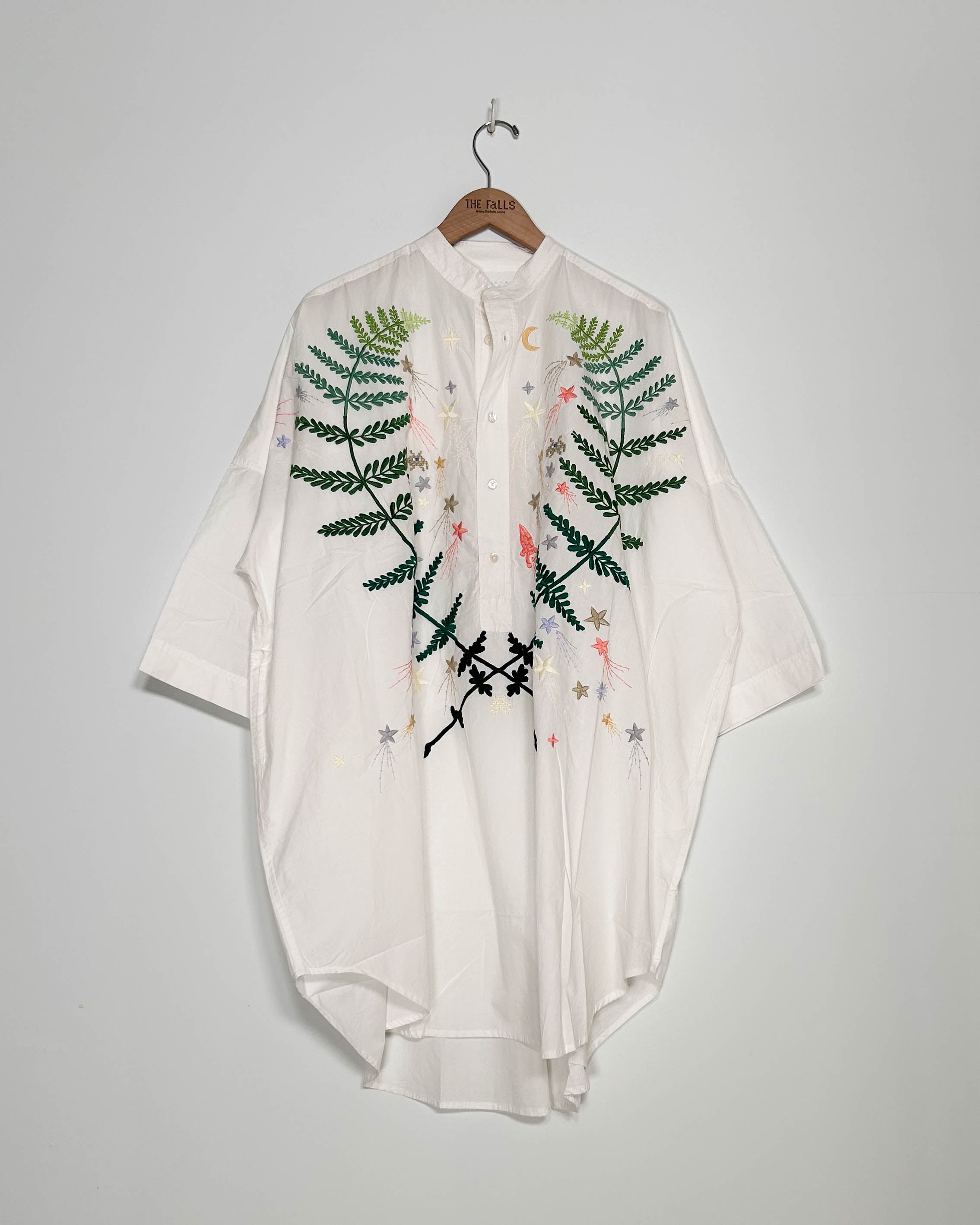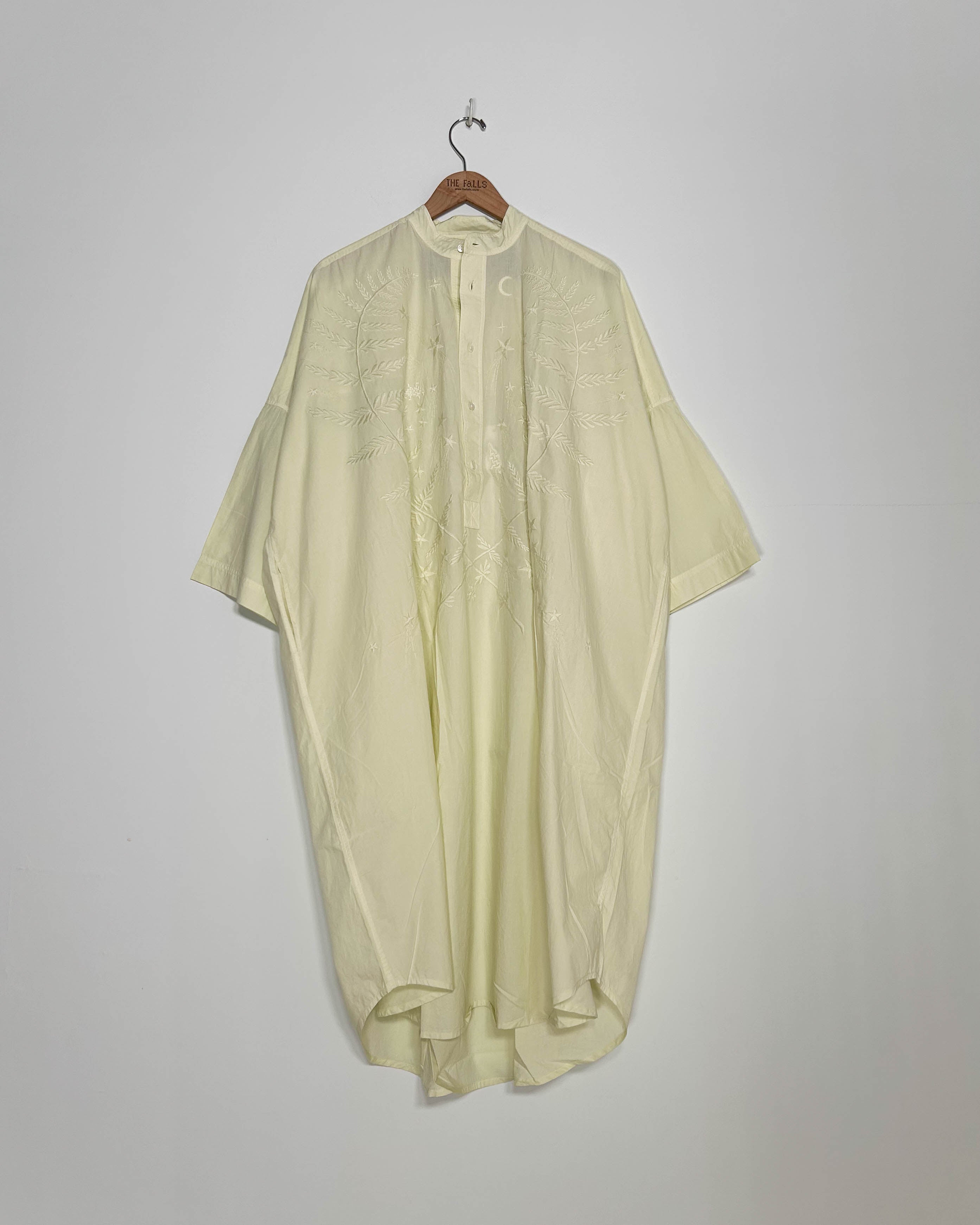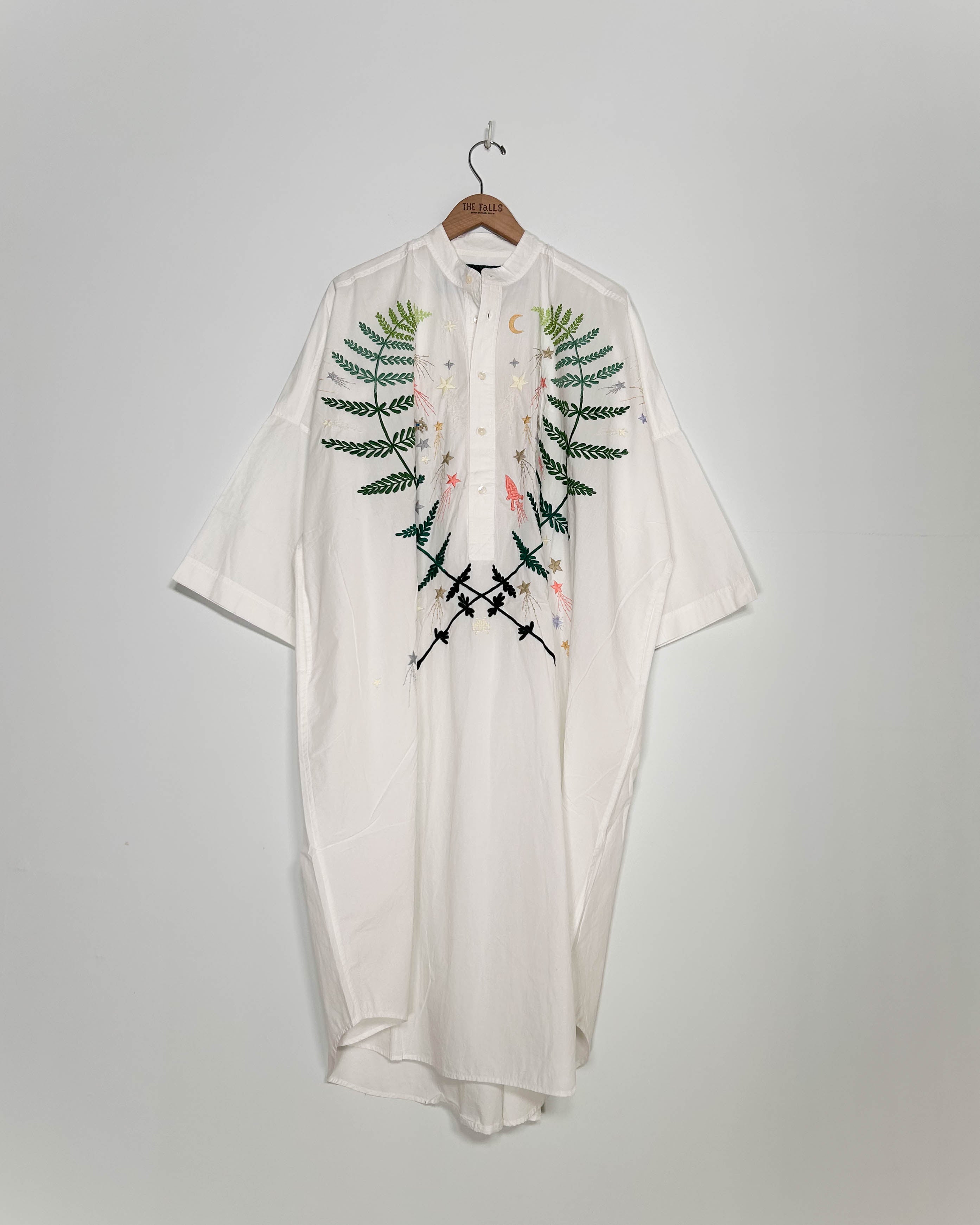 Inspired by a cherished Victorian men’s nightshirt, our kaftans reimagine that simple, elegant silhouette as an intentionally oversized popover. The fit remains consistent season after season, while the embroidered motifs evolve —stars, moons, flowers, and delicate garlands with The Falls' motifs such as rockets, invaders and emojis that feel both authentic and timeless. Crafted from soft organic cotton poplin, it’s one of the few garments in our collection made entirely from virgin materials. Each piece is garment-dyed with natural vegetable dyes, a slow botanical process that creates subtle, organic tone variations — no two shirts ever emerge exactly alike.