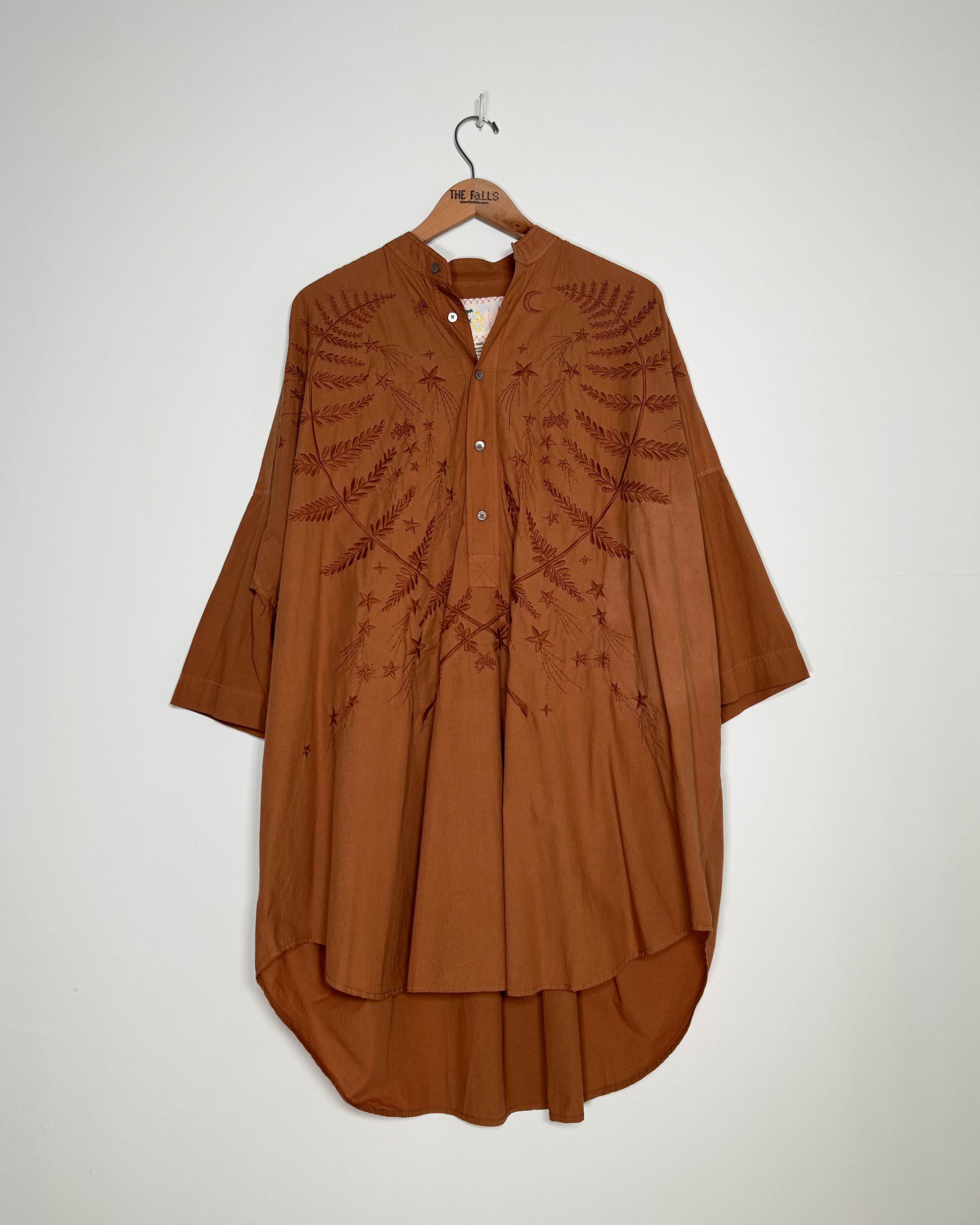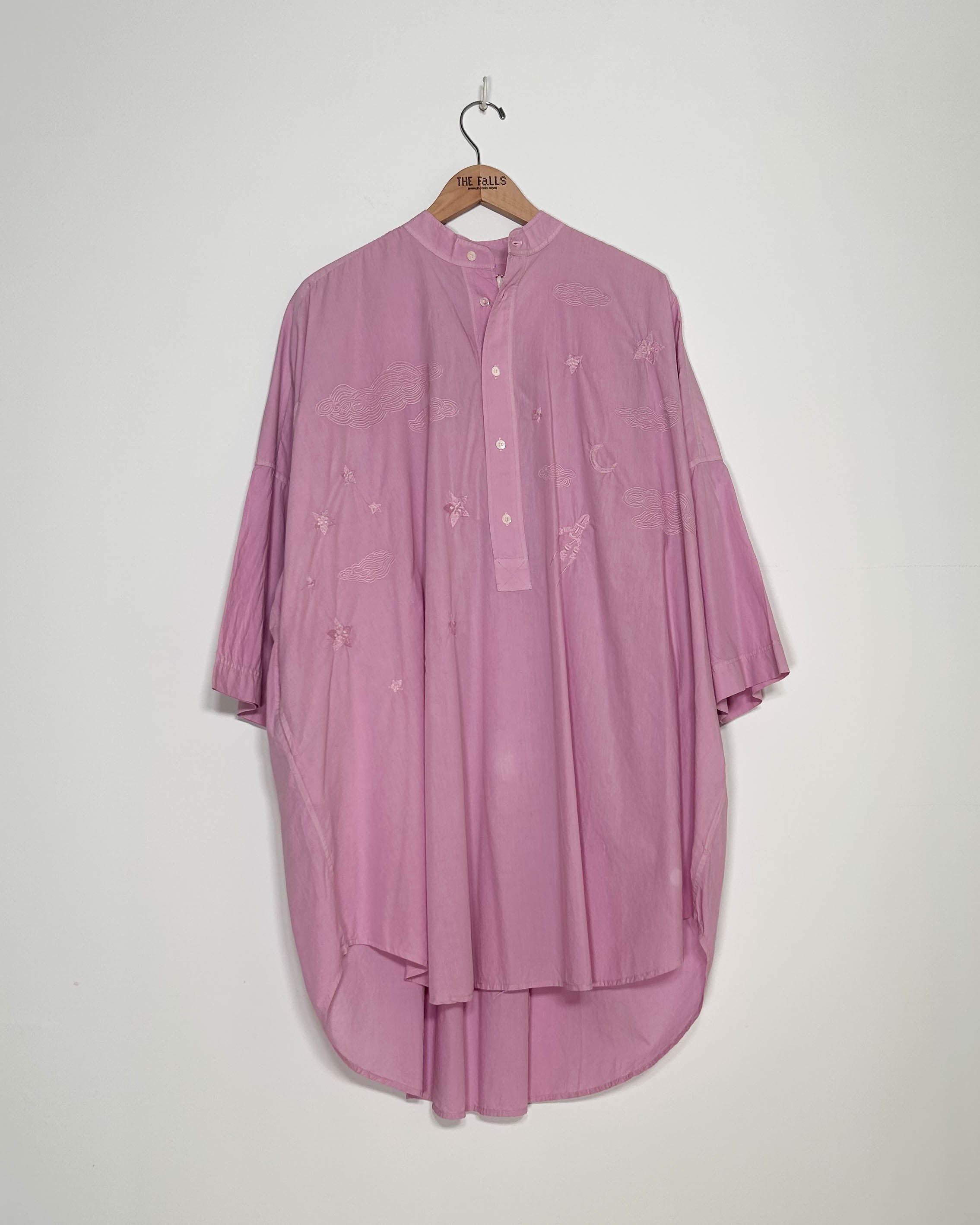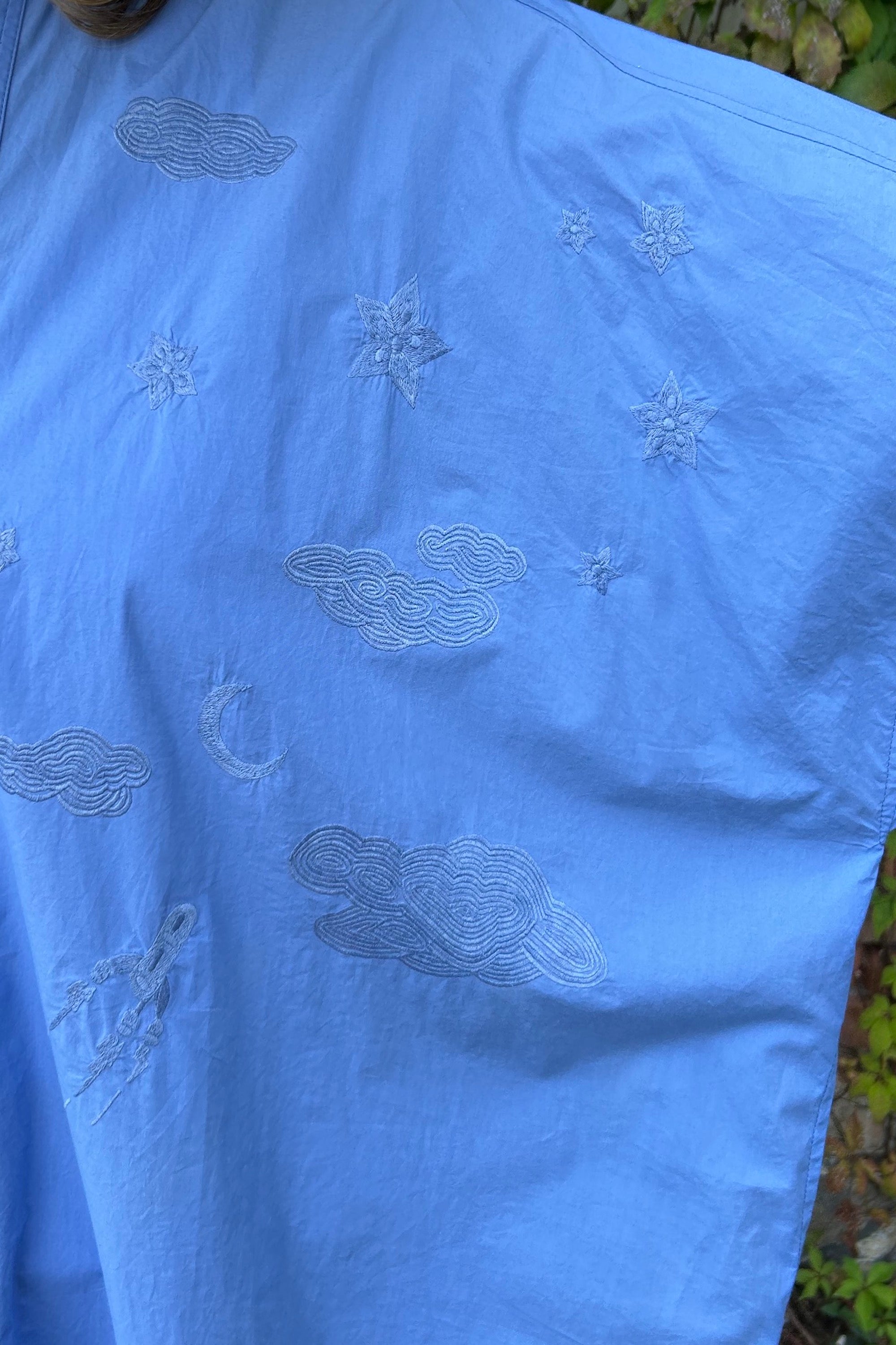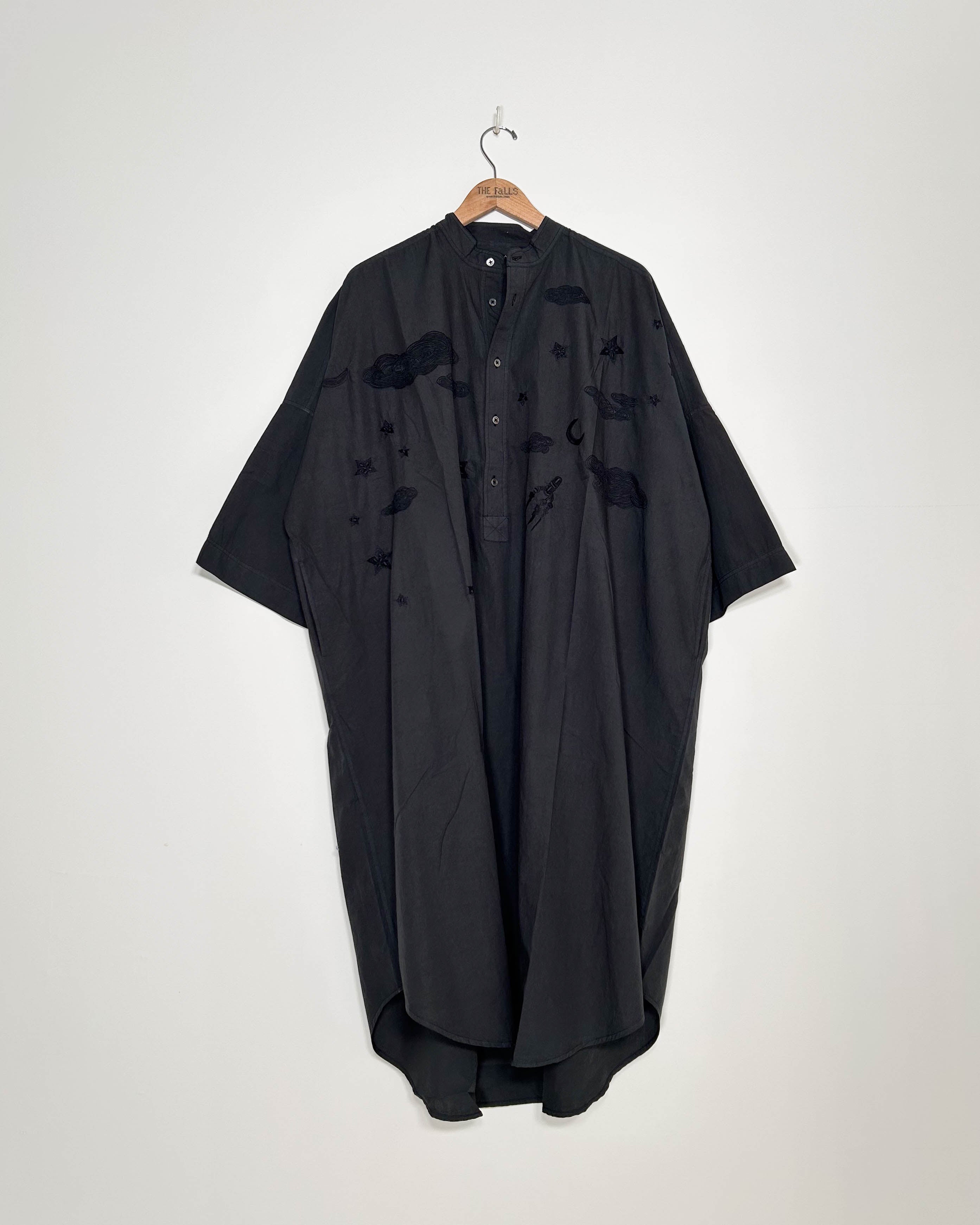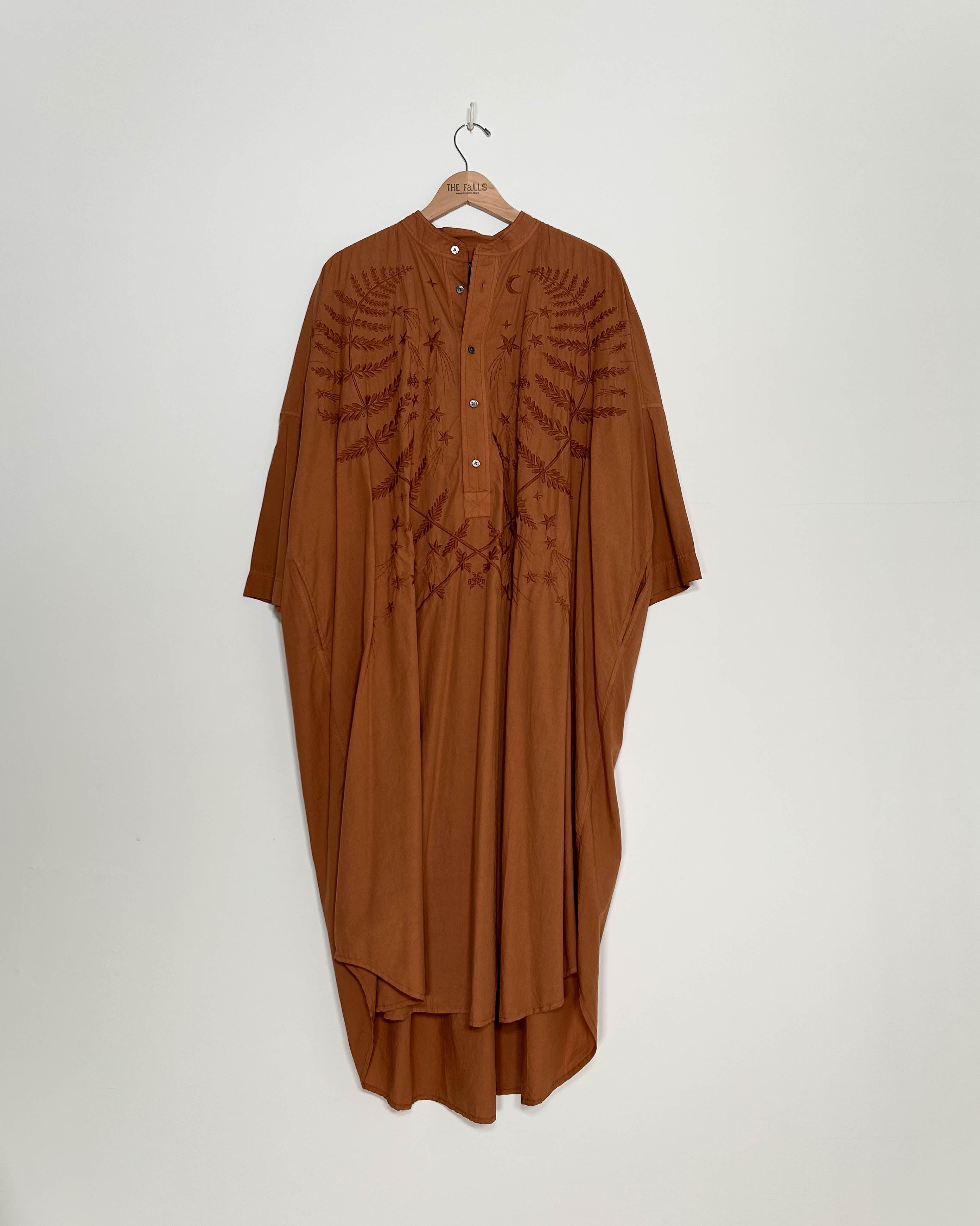 Inspired by a cherished Victorian men’s nightshirt, our kaftans reimagine that simple, elegant silhouette as an intentionally oversized popover. The fit remains consistent season after season, while the embroidered motifs evolve —stars, moons, flowers, and delicate garlands with The Falls' motifs such as rockets, invaders and emojis that feel both authentic and timeless. Crafted from soft organic cotton poplin, it’s one of the few garments in our collection made entirely from virgin materials. Each piece is garment-dyed with natural vegetable dyes, a slow botanical process that creates subtle, organic tone variations — no two shirts ever emerge exactly alike.