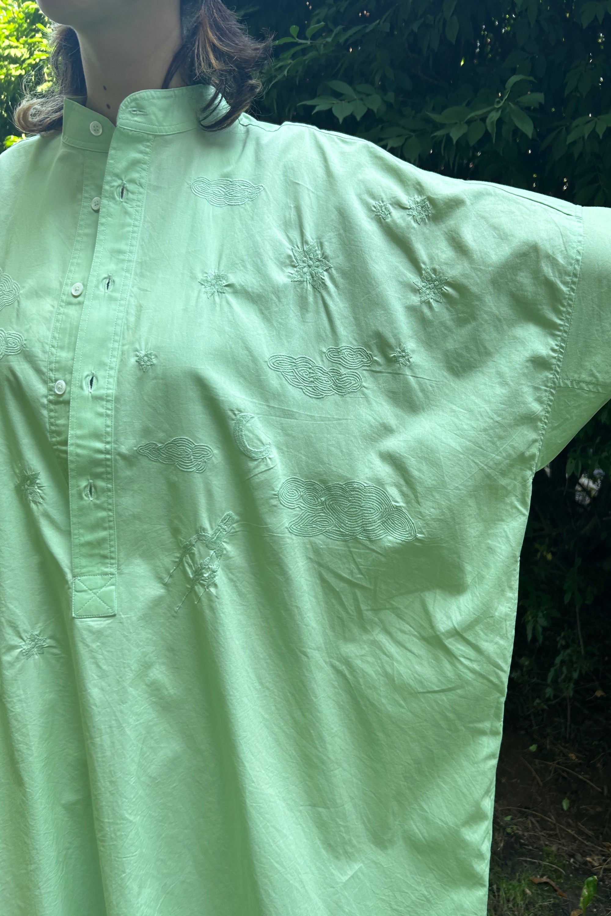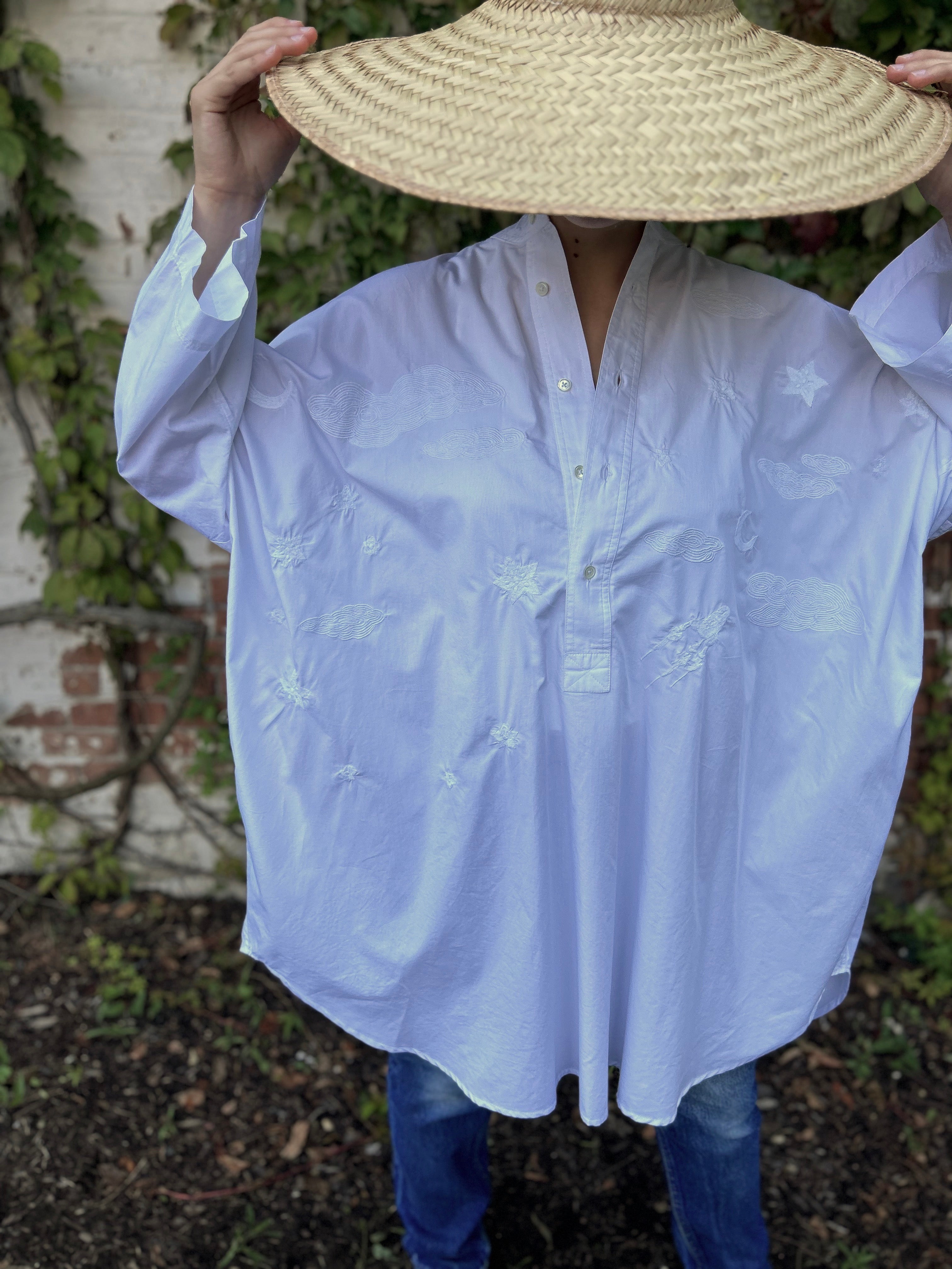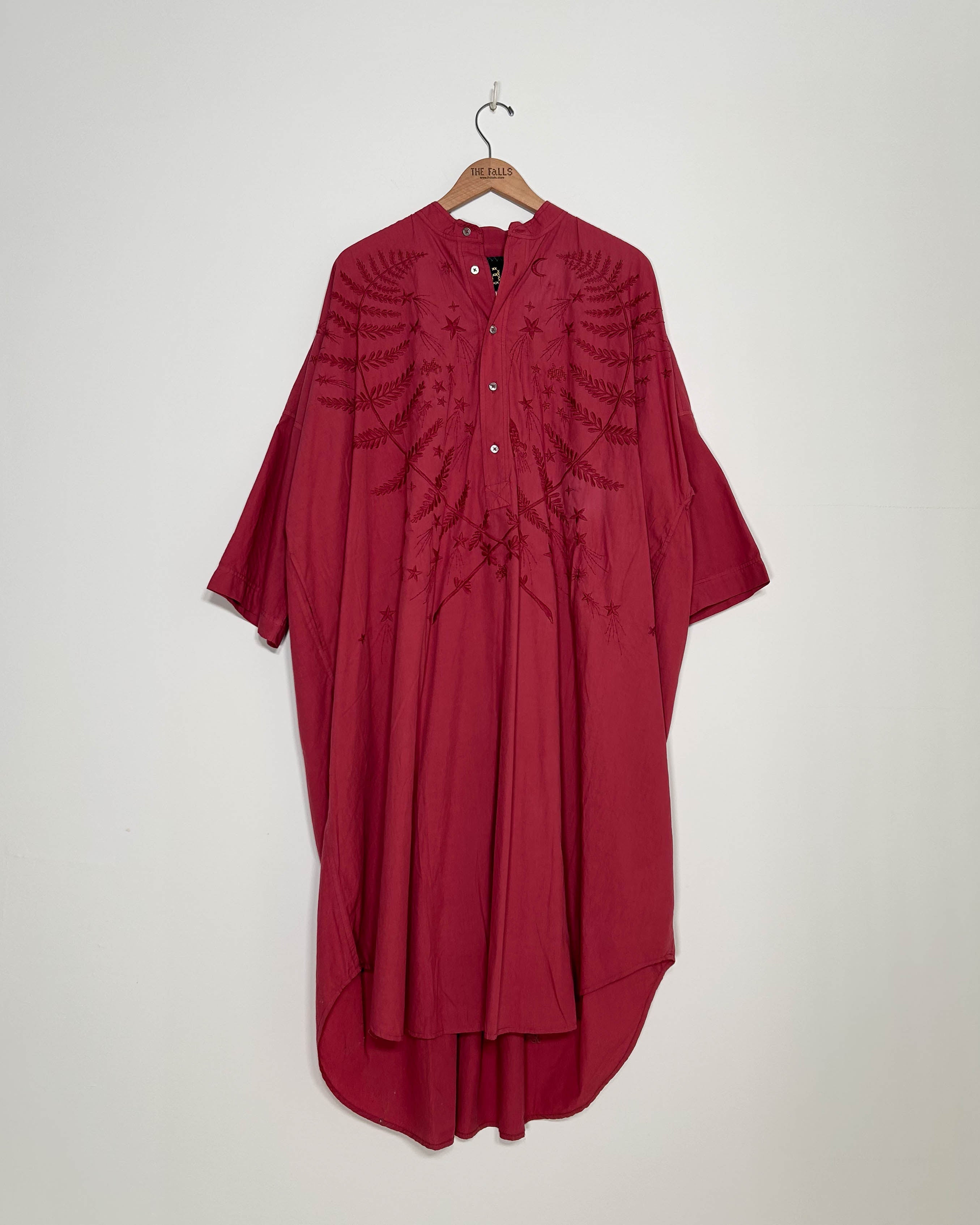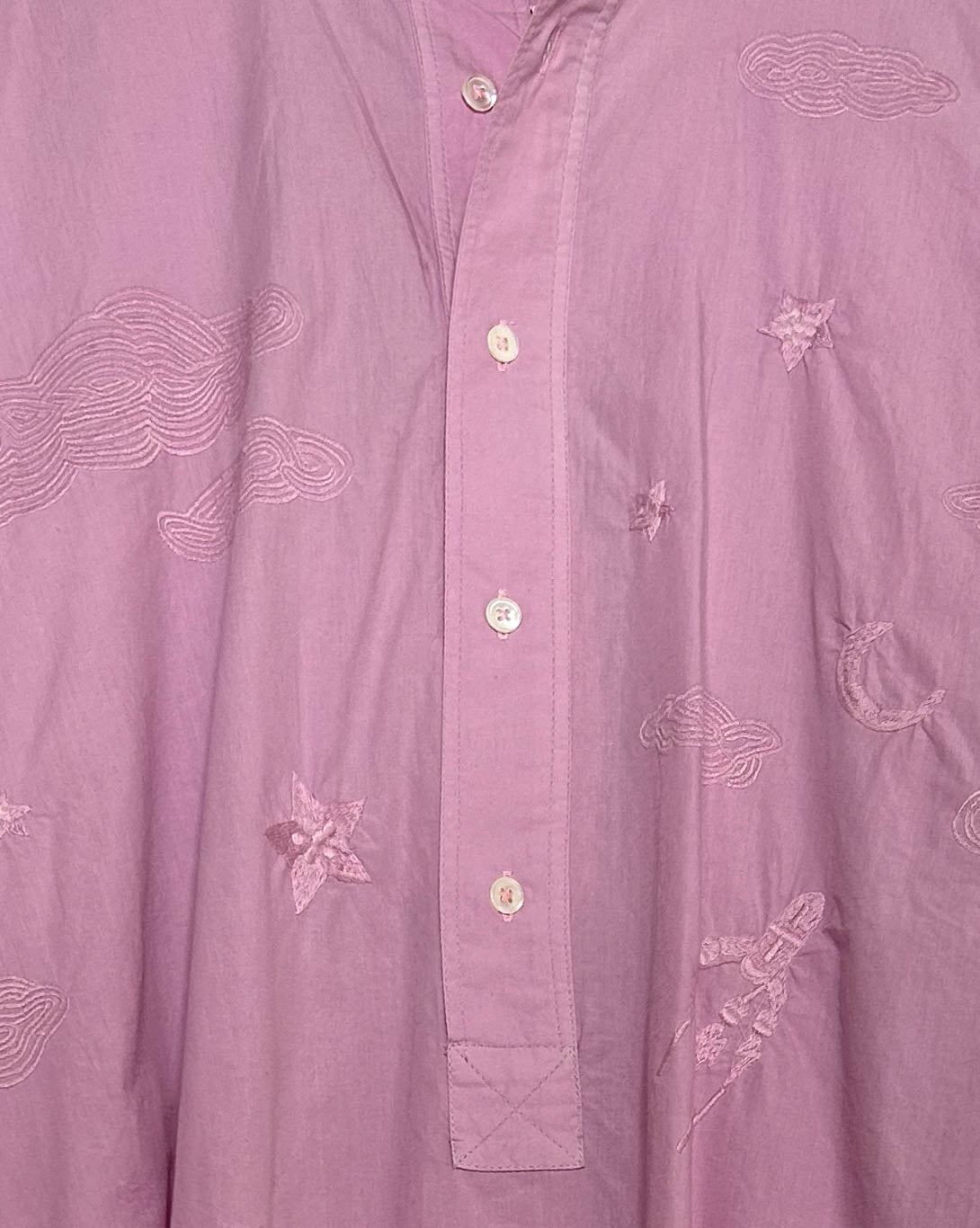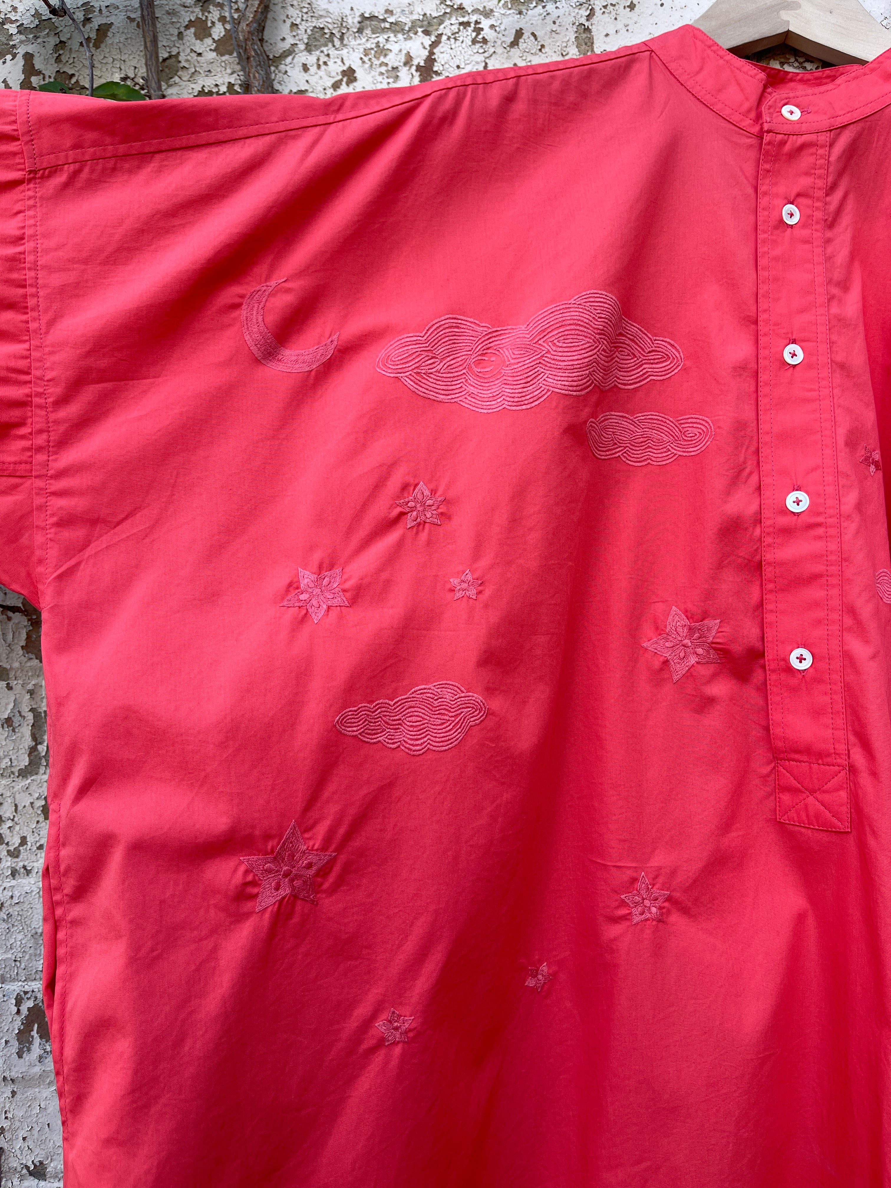Inspired by a cherished Victorian men’s nightshirt, our kaftans reimagine that simple, elegant silhouette as an intentionally oversized popover. The fit remains consistent season after season, while the embroidered motifs evolve —stars, moons, flowers, and delicate garlands with The Falls' motifs such as rockets, invaders and emojis that feel both authentic and timeless. Crafted from soft organic cotton poplin, it’s one of the few garments in our collection made entirely from virgin materials. Each piece is garment-dyed with natural vegetable dyes, a slow botanical process that creates subtle, organic tone variations — no two shirts ever emerge exactly alike.
