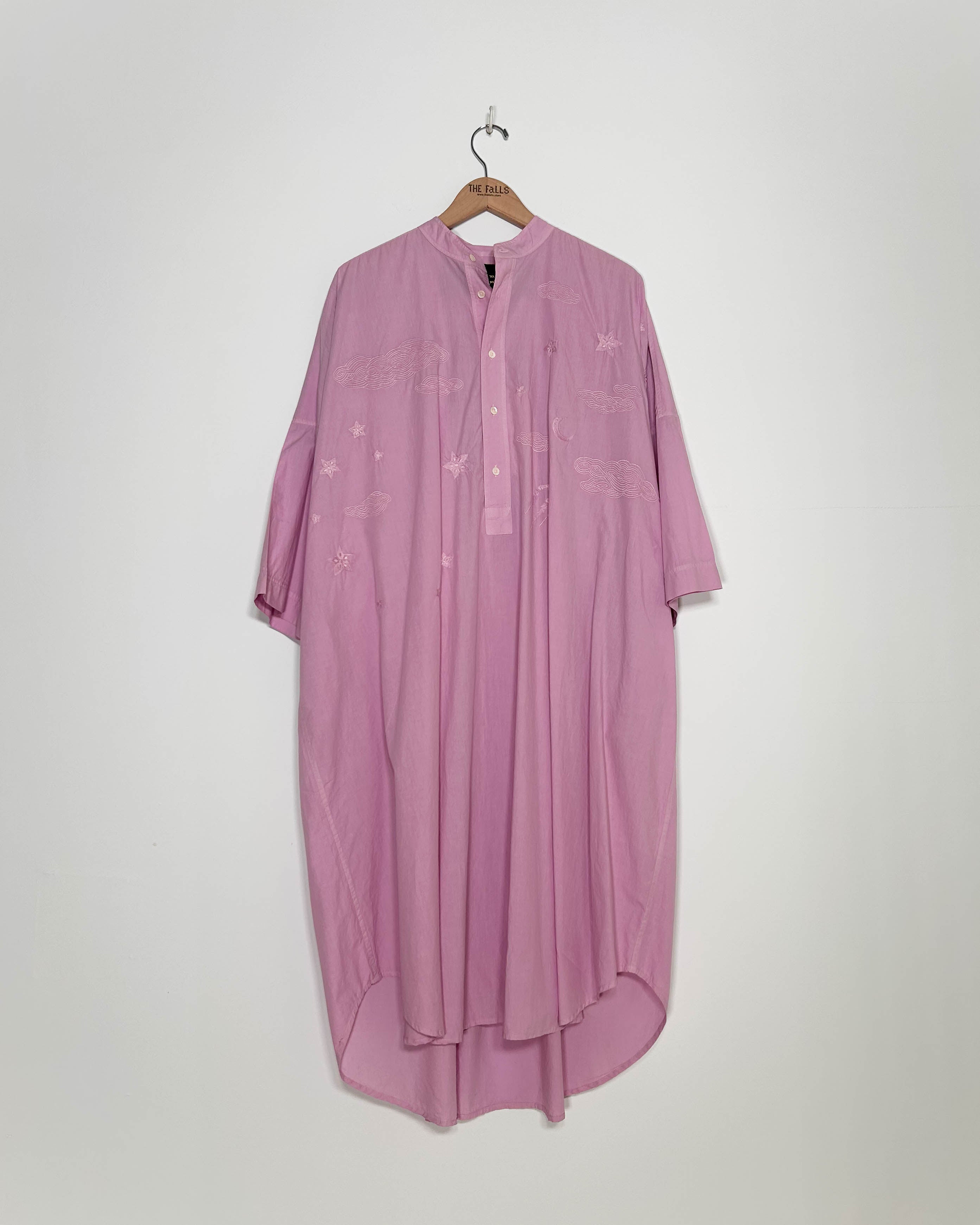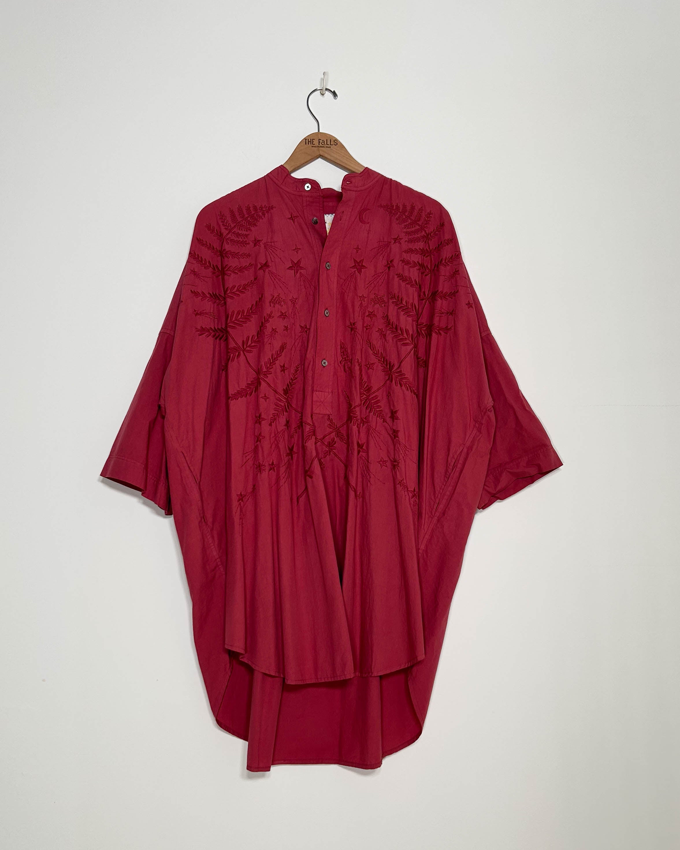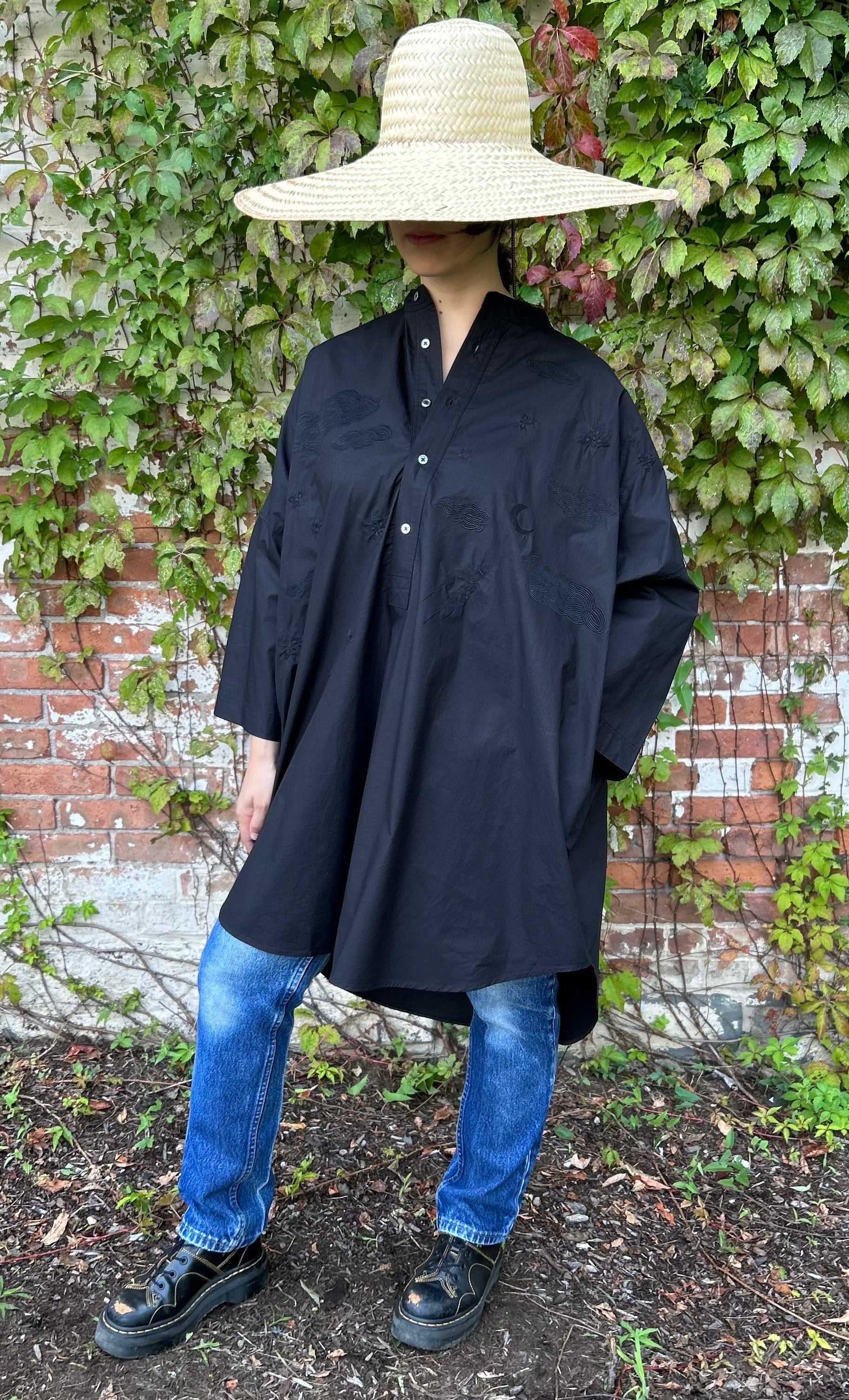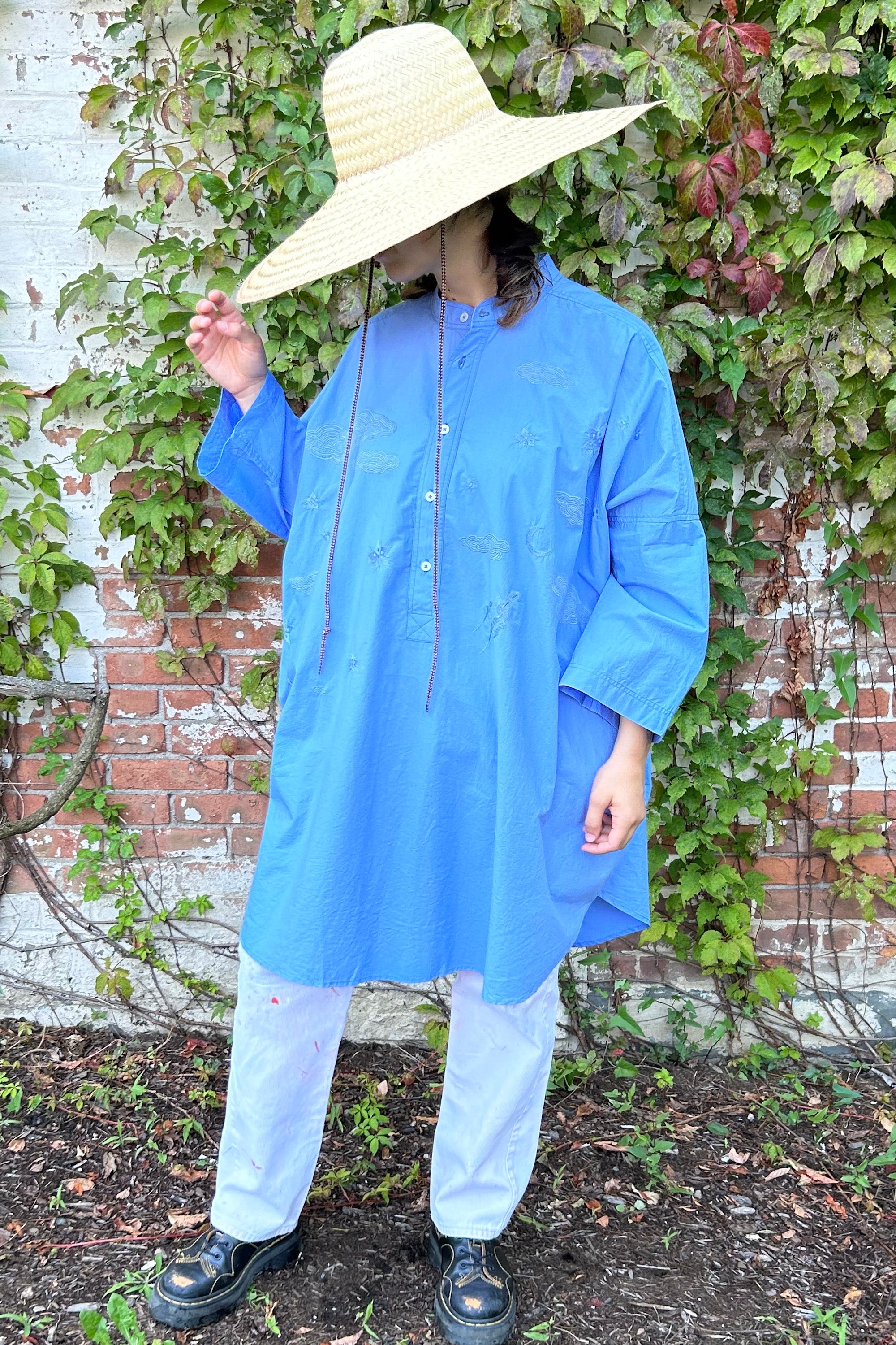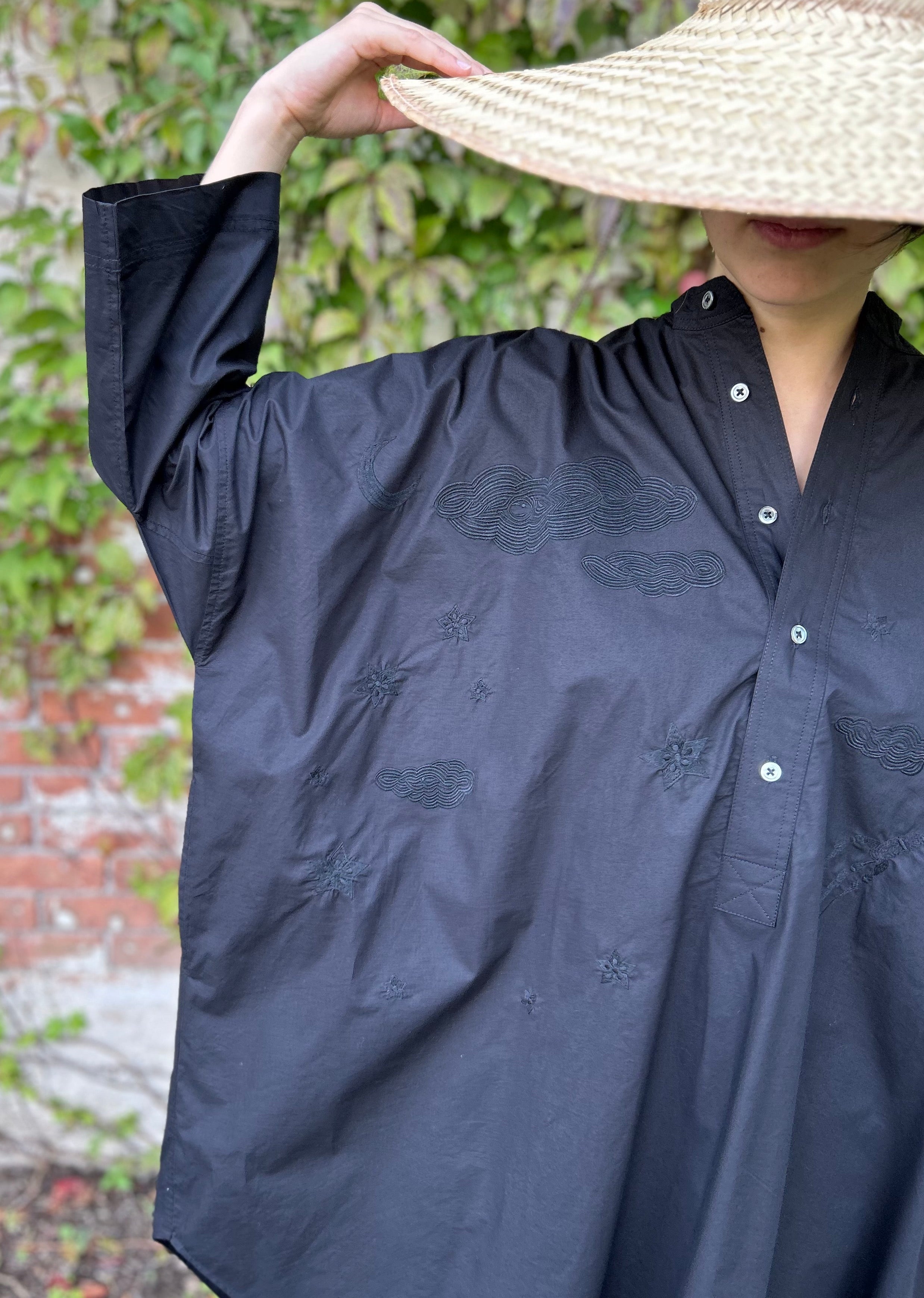 Inspired by a cherished Victorian men’s nightshirt, our kaftans reimagine that simple, elegant silhouette as an intentionally oversized popover. The fit remains consistent season after season, while the embroidered motifs evolve —stars, moons, flowers, and delicate garlands with The Falls' motifs such as rockets, invaders and emojis that feel both authentic and timeless. Crafted from soft organic cotton poplin, it’s one of the few garments in our collection made entirely from virgin materials. Each piece is garment-dyed with natural vegetable dyes, a slow botanical process that creates subtle, organic tone variations — no two shirts ever emerge exactly alike.