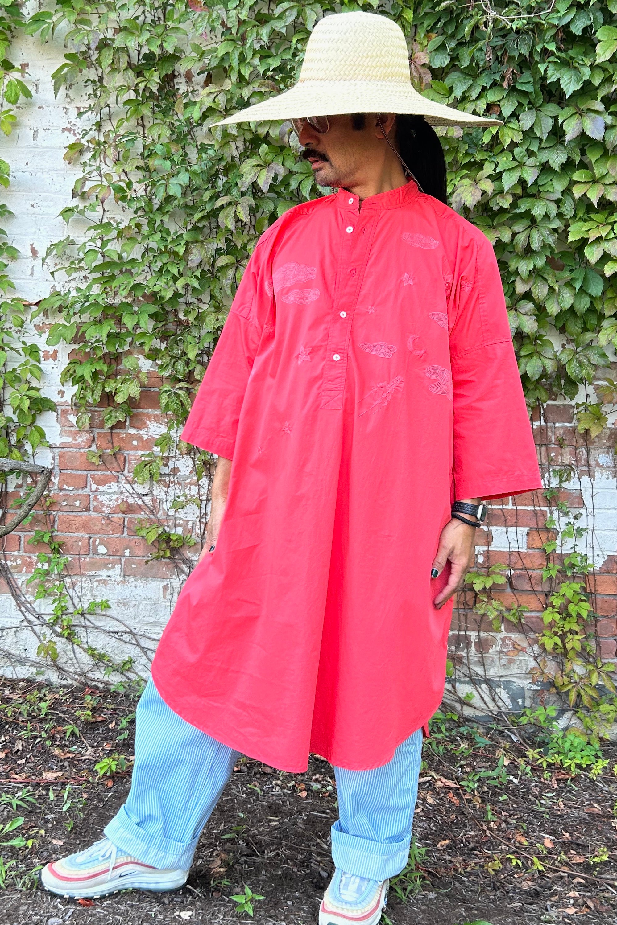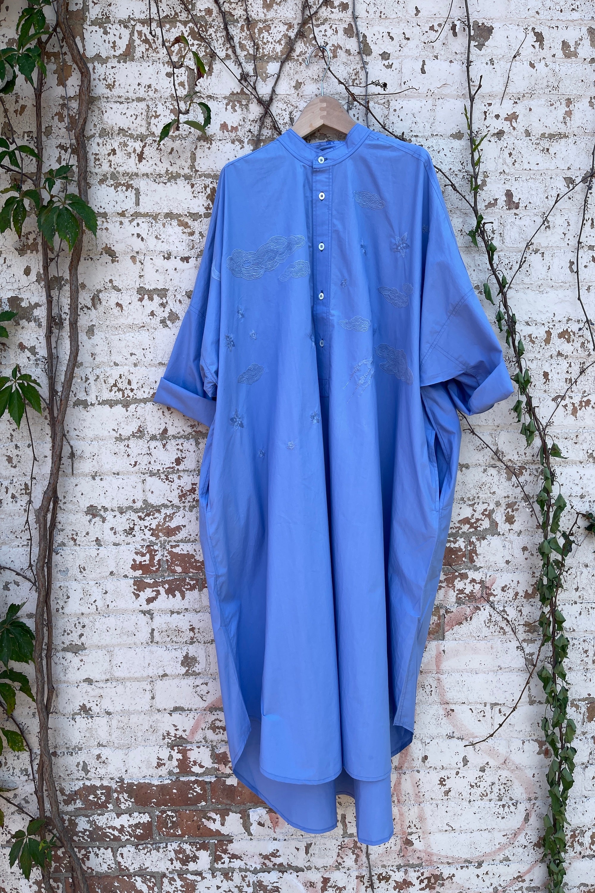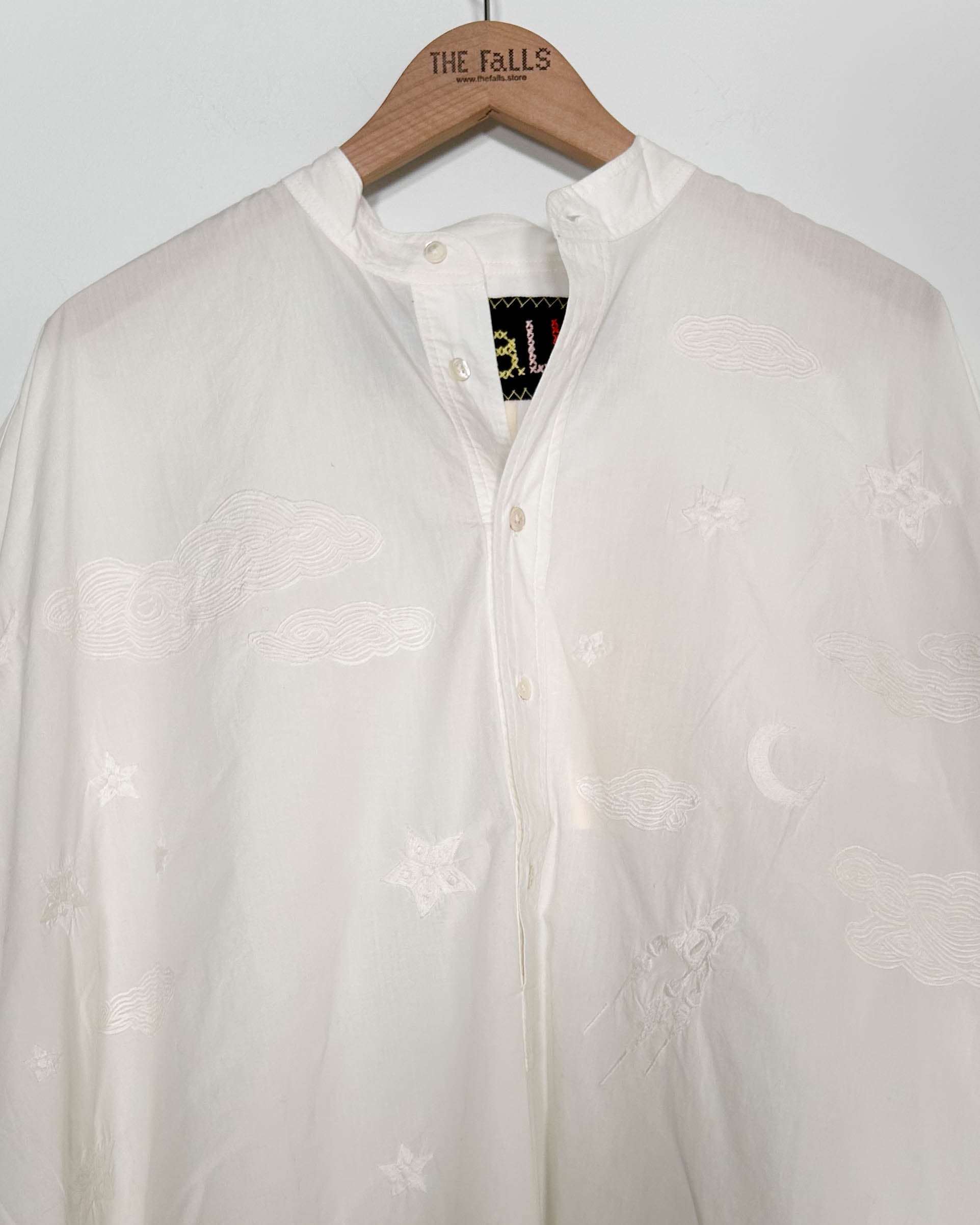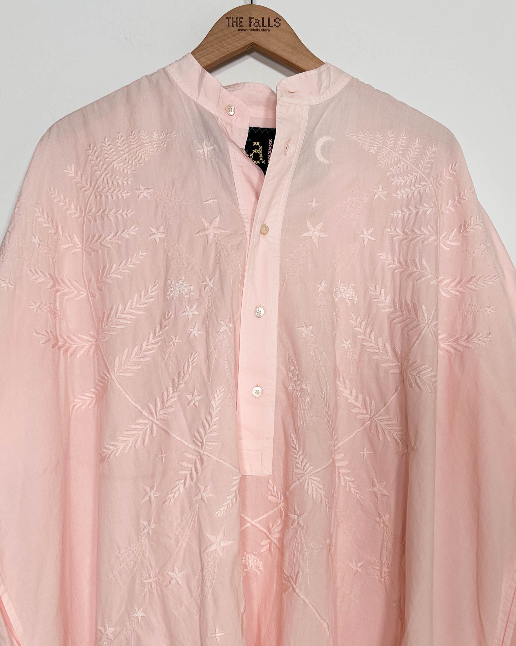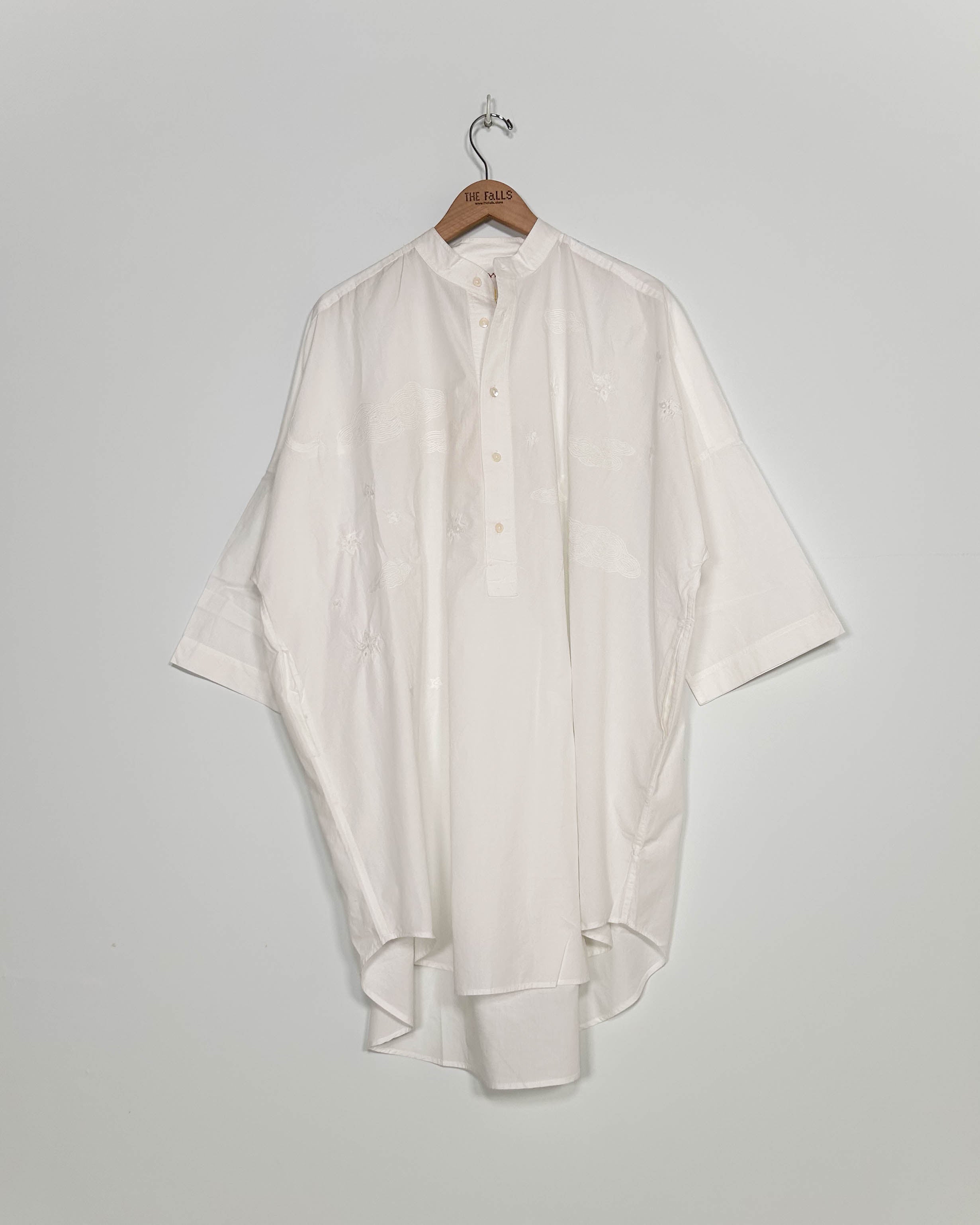 Inspired by a cherished Victorian men’s nightshirt, our kaftans reimagine that simple, elegant silhouette as an intentionally oversized popover. The fit remains consistent season after season, while the embroidered motifs evolve —stars, moons, flowers, and delicate garlands with The Falls' motifs such as rockets, invaders and emojis that feel both authentic and timeless. Crafted from soft organic cotton poplin, it’s one of the few garments in our collection made entirely from virgin materials. Each piece is garment-dyed with natural vegetable dyes, a slow botanical process that creates subtle, organic tone variations — no two shirts ever emerge exactly alike.