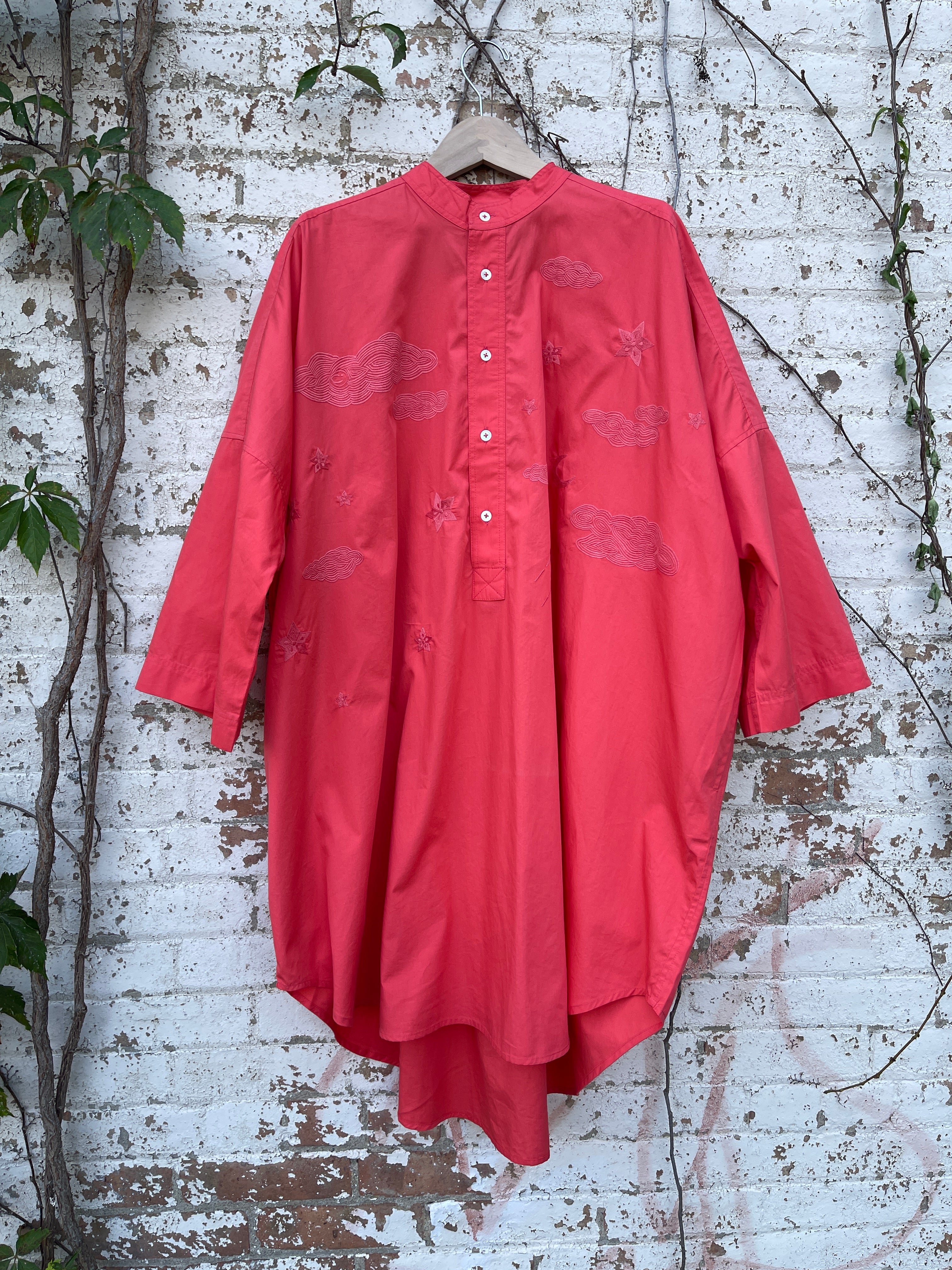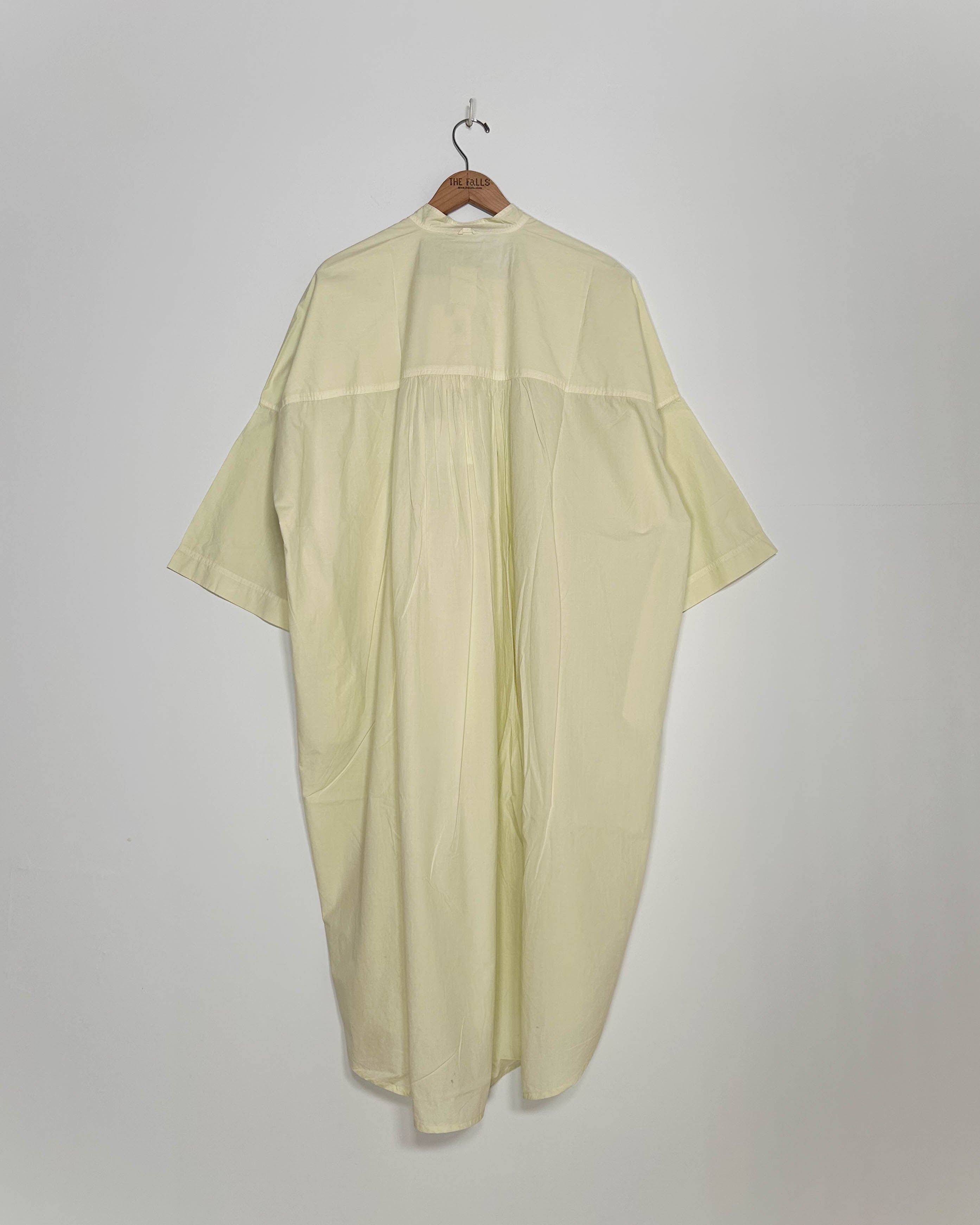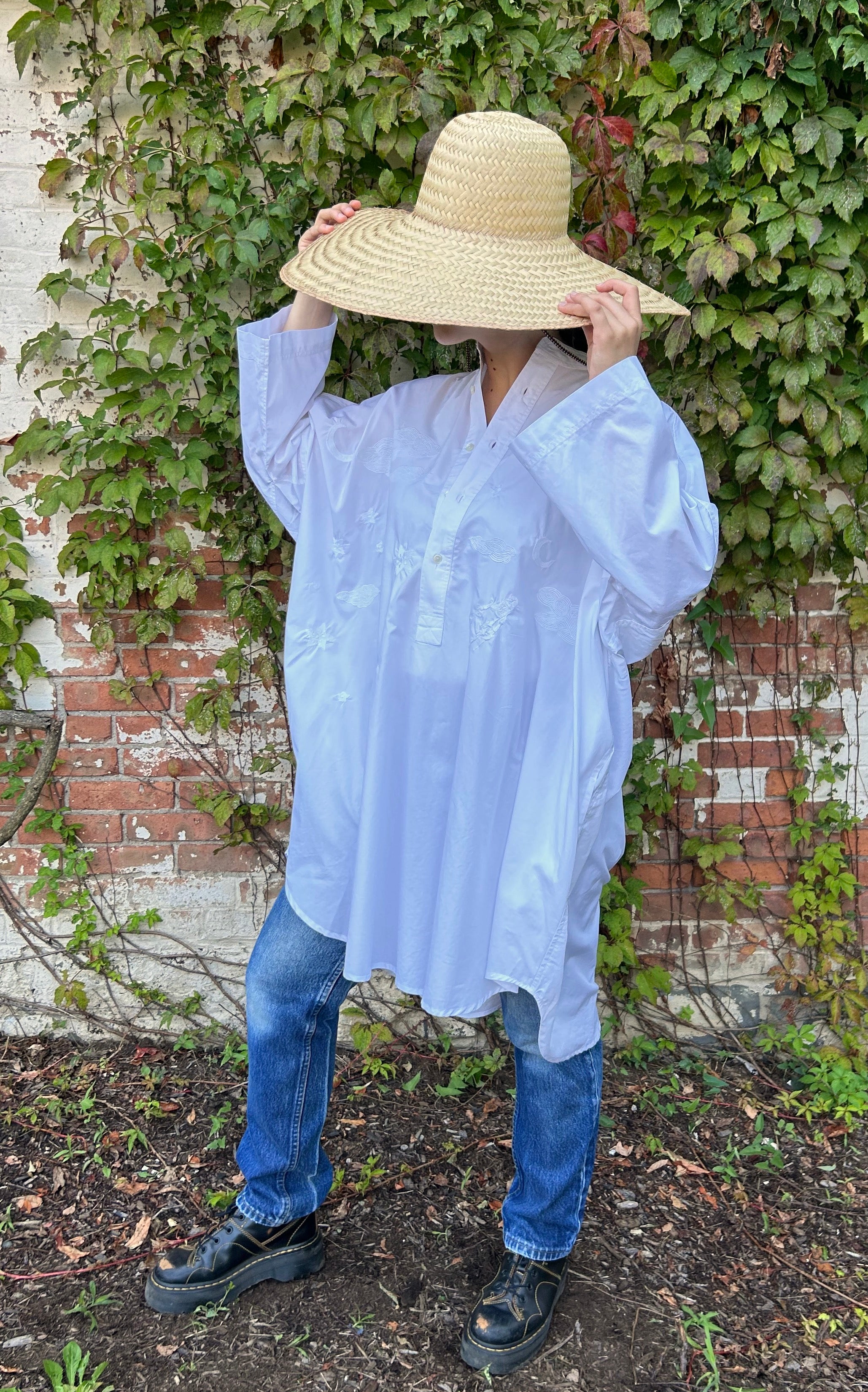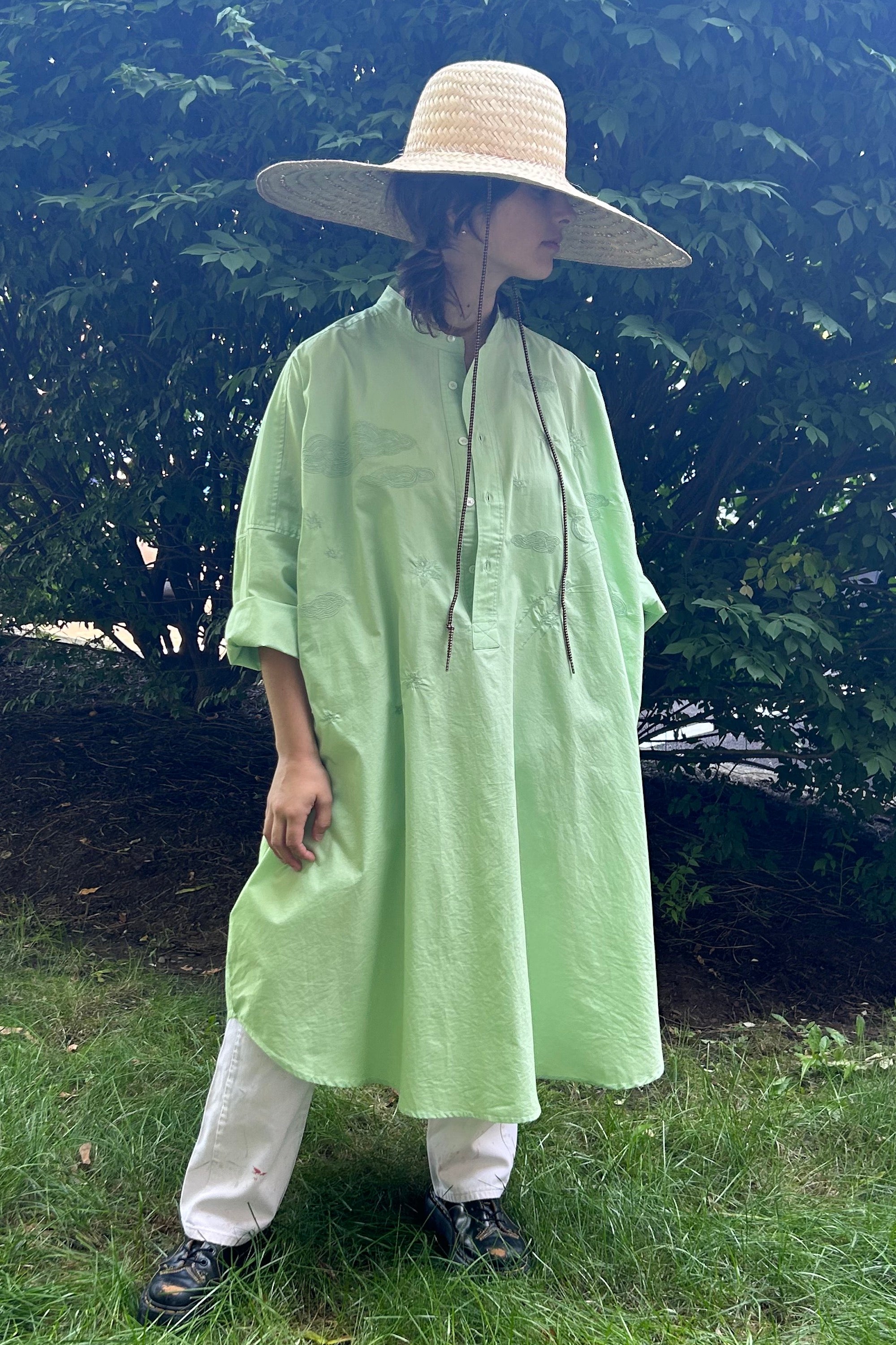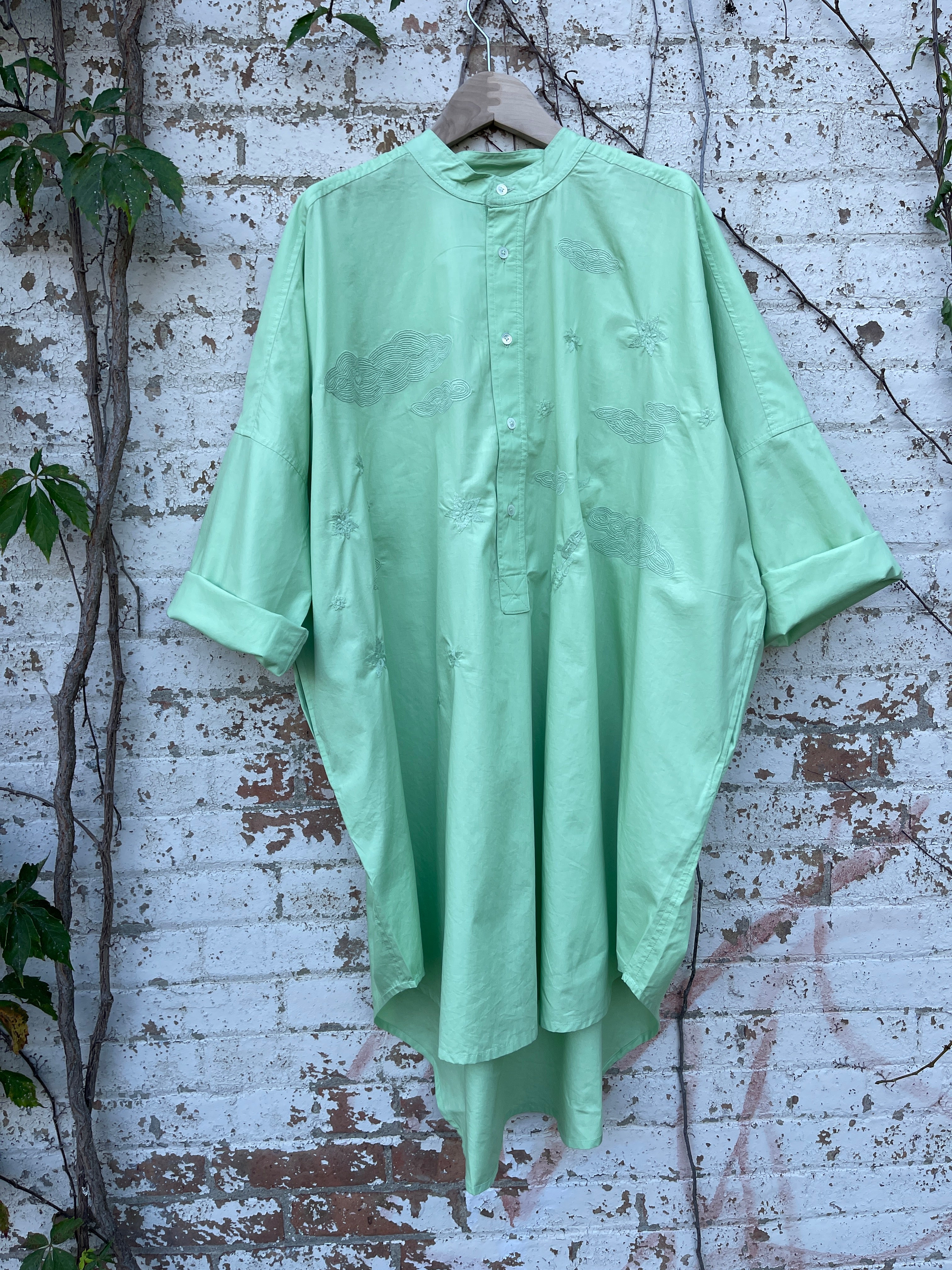 Inspired by a cherished Victorian men’s nightshirt, our kaftans reimagine that simple, elegant silhouette as an intentionally oversized popover. The fit remains consistent season after season, while the embroidered motifs evolve —stars, moons, flowers, and delicate garlands with The Falls' motifs such as rockets, invaders and emojis that feel both authentic and timeless. Crafted from soft organic cotton poplin, it’s one of the few garments in our collection made entirely from virgin materials. Each piece is garment-dyed with natural vegetable dyes, a slow botanical process that creates subtle, organic tone variations — no two shirts ever emerge exactly alike.