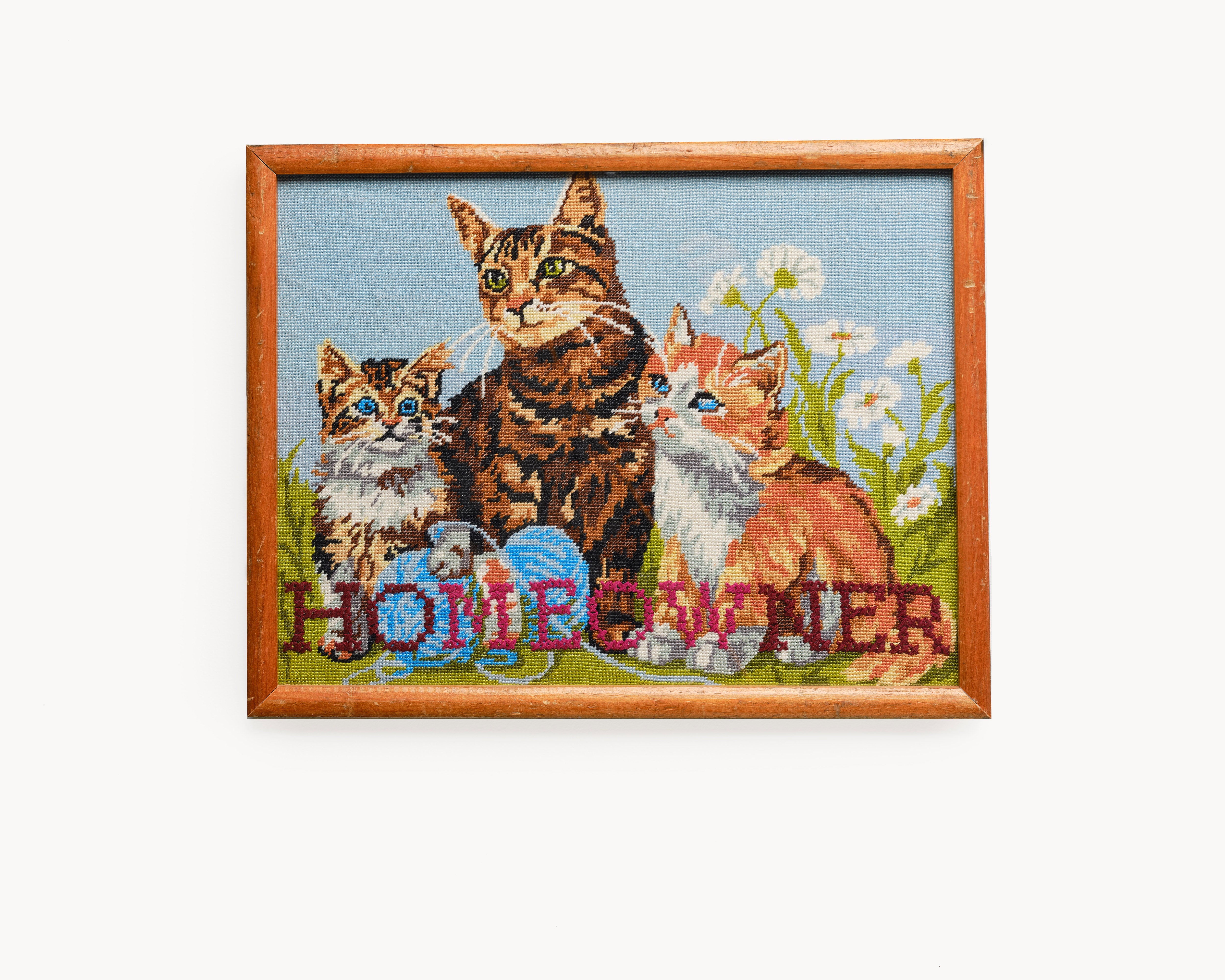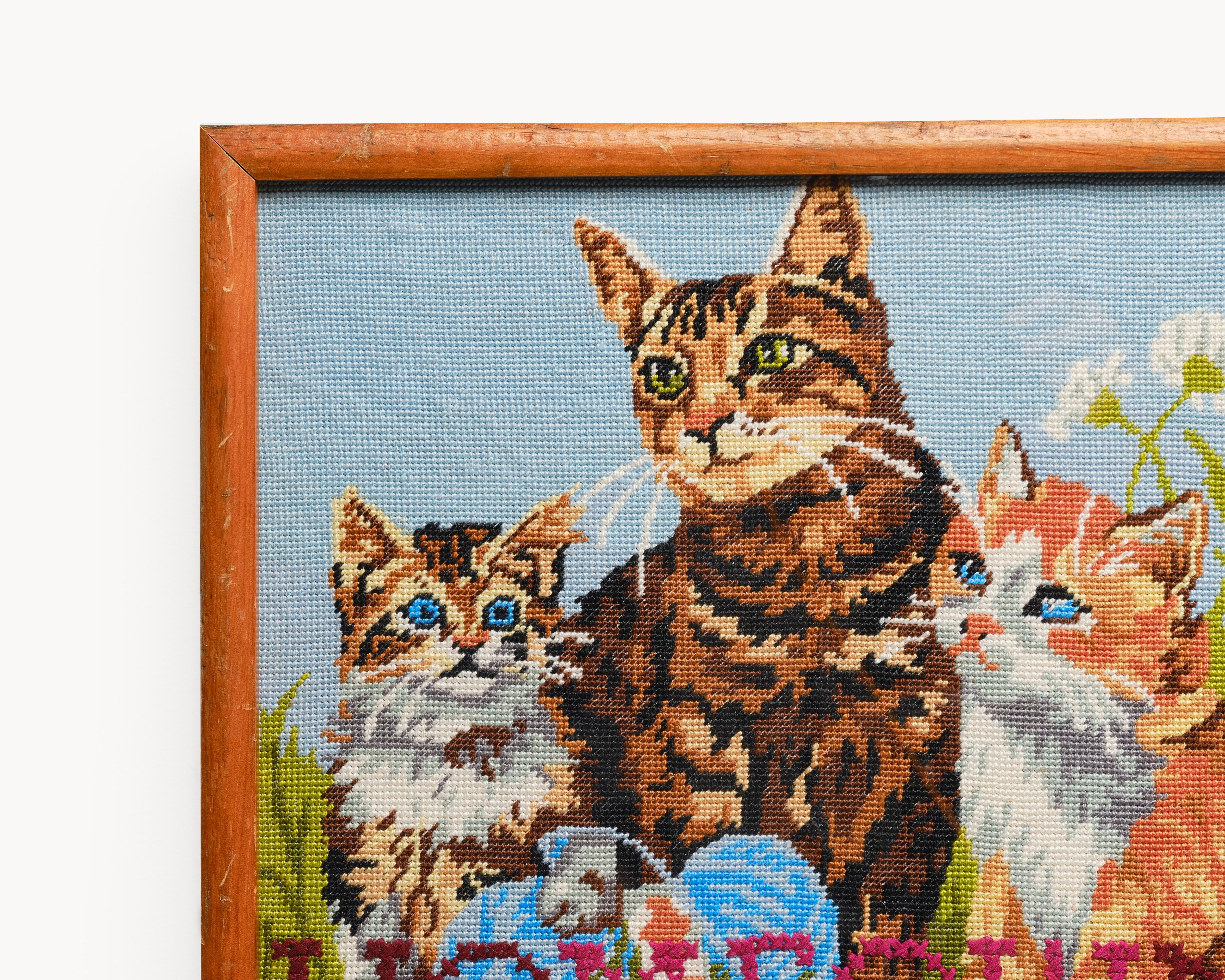 Rescued 1970's Kit tapestry of 3 cats in field of daisies with blue wool. Found in MA and reworked with hand embroidered sentiment in India. Framed in rescued and resized vintage midcentury frame in the Hudson Valley.