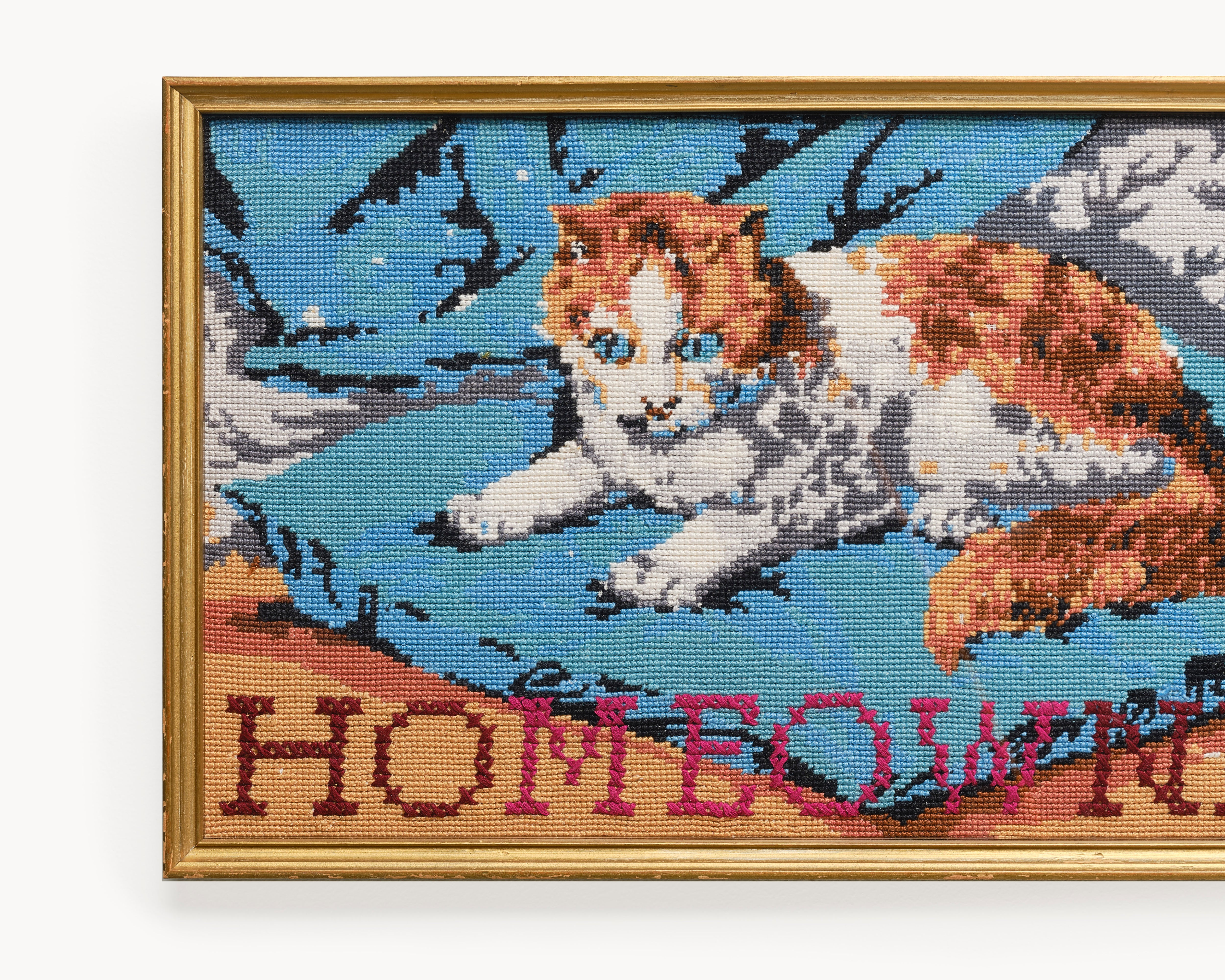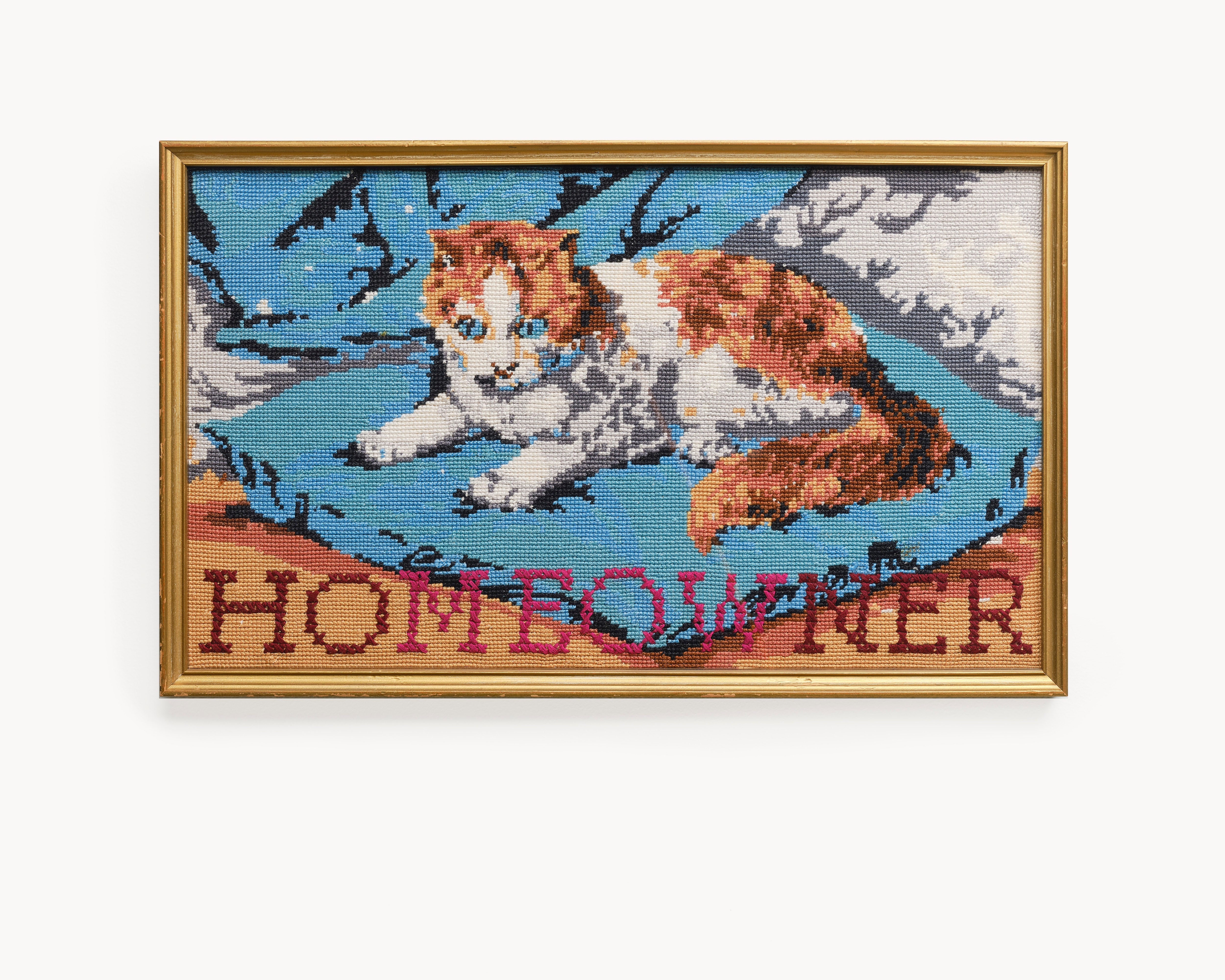 Rescued 1970's Kit tapestry of calico cat on his pillow. Found in MA and reworked with hand embroidered sentiment in India. Framed in rescued and resized vintage wood frame in the Hudson Valley.