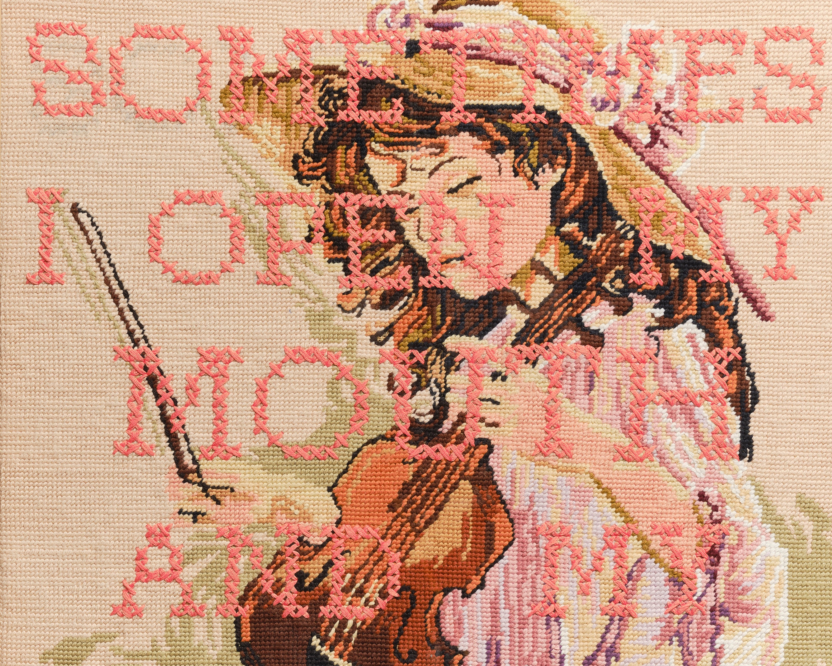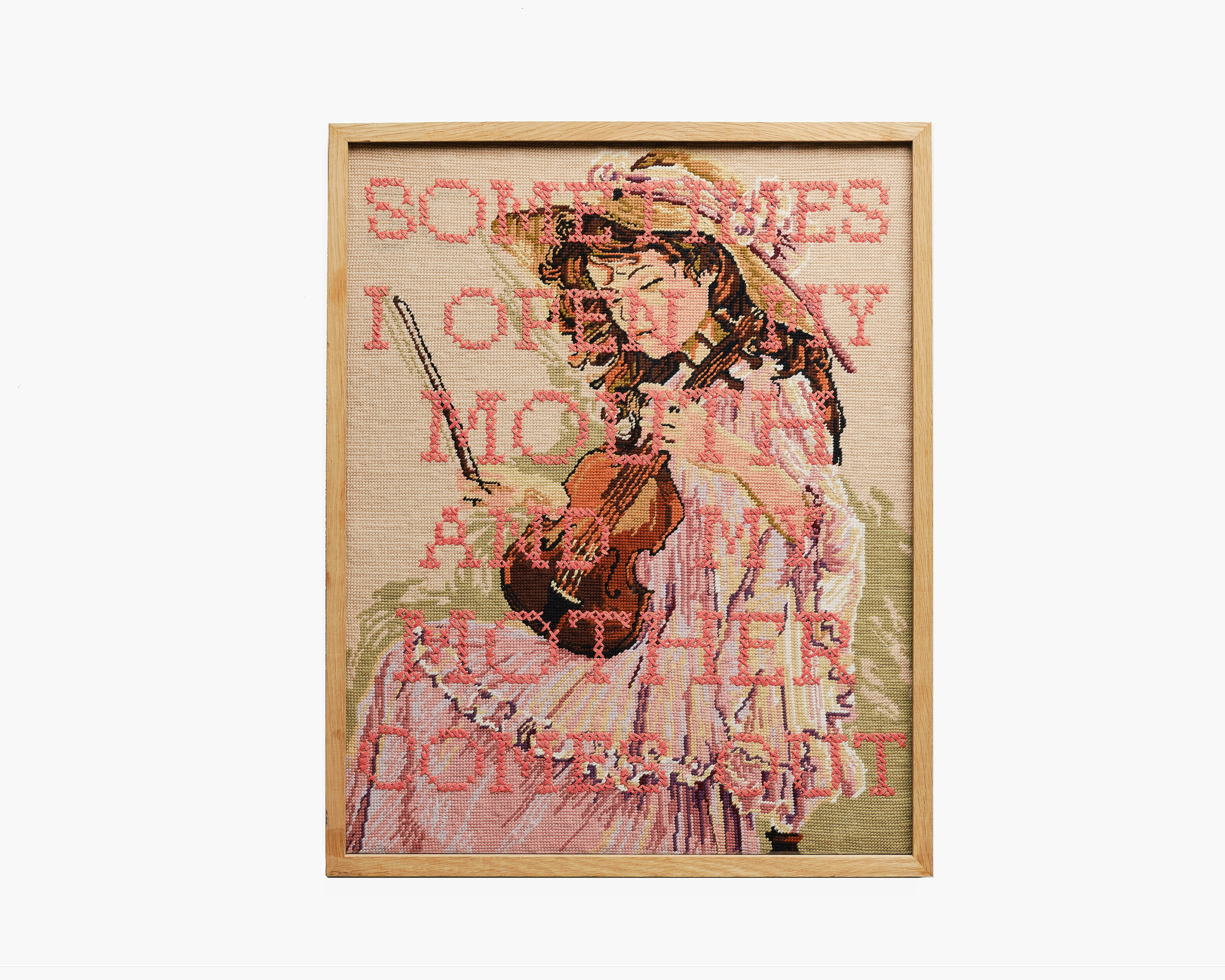 Rescued 1970's Kit tapestry of girl playing violin. Found in Paris and reworked with hand embroidered sentiment in India. Framed in rescued and resized blonde wood frame in the Hudson Valley.