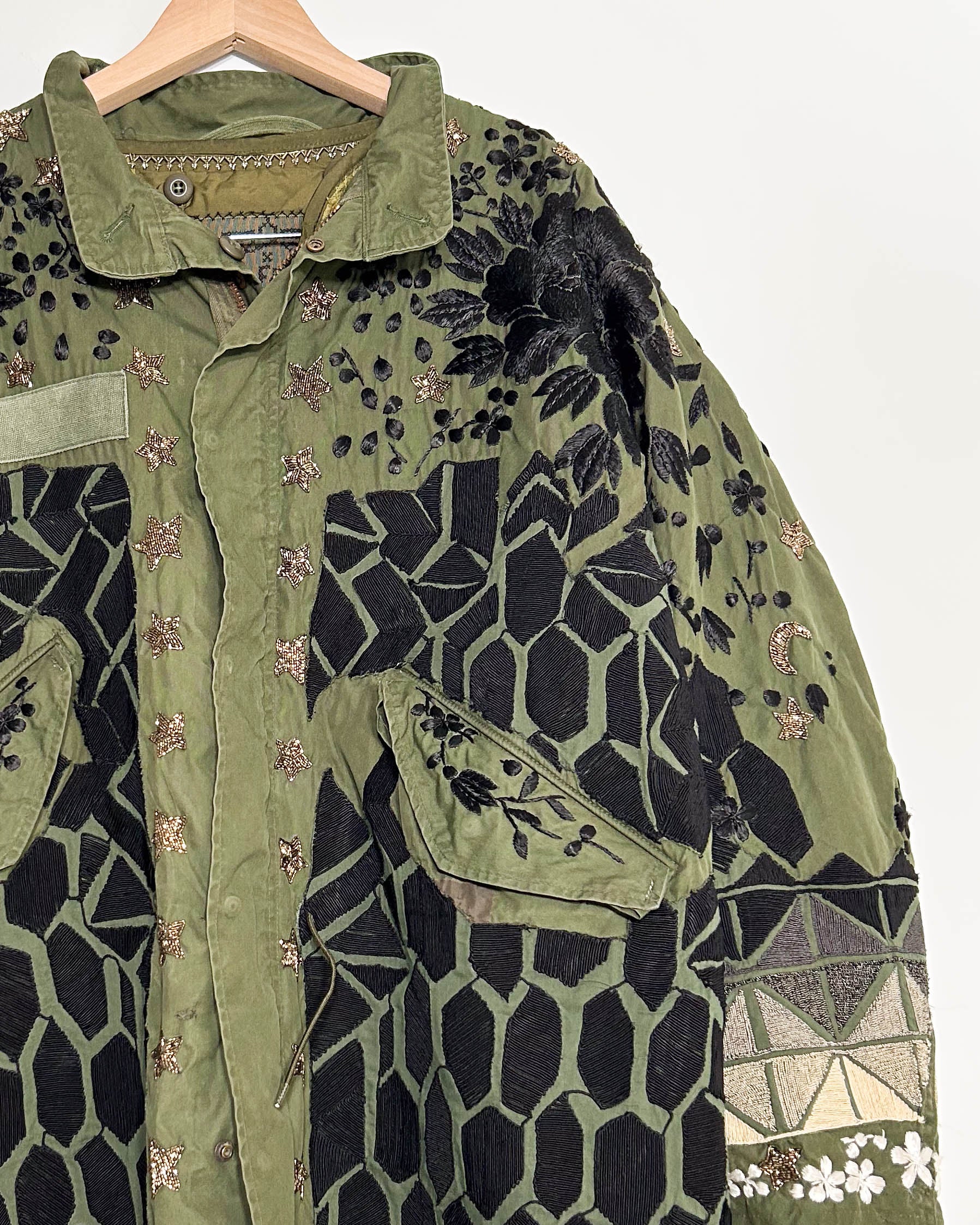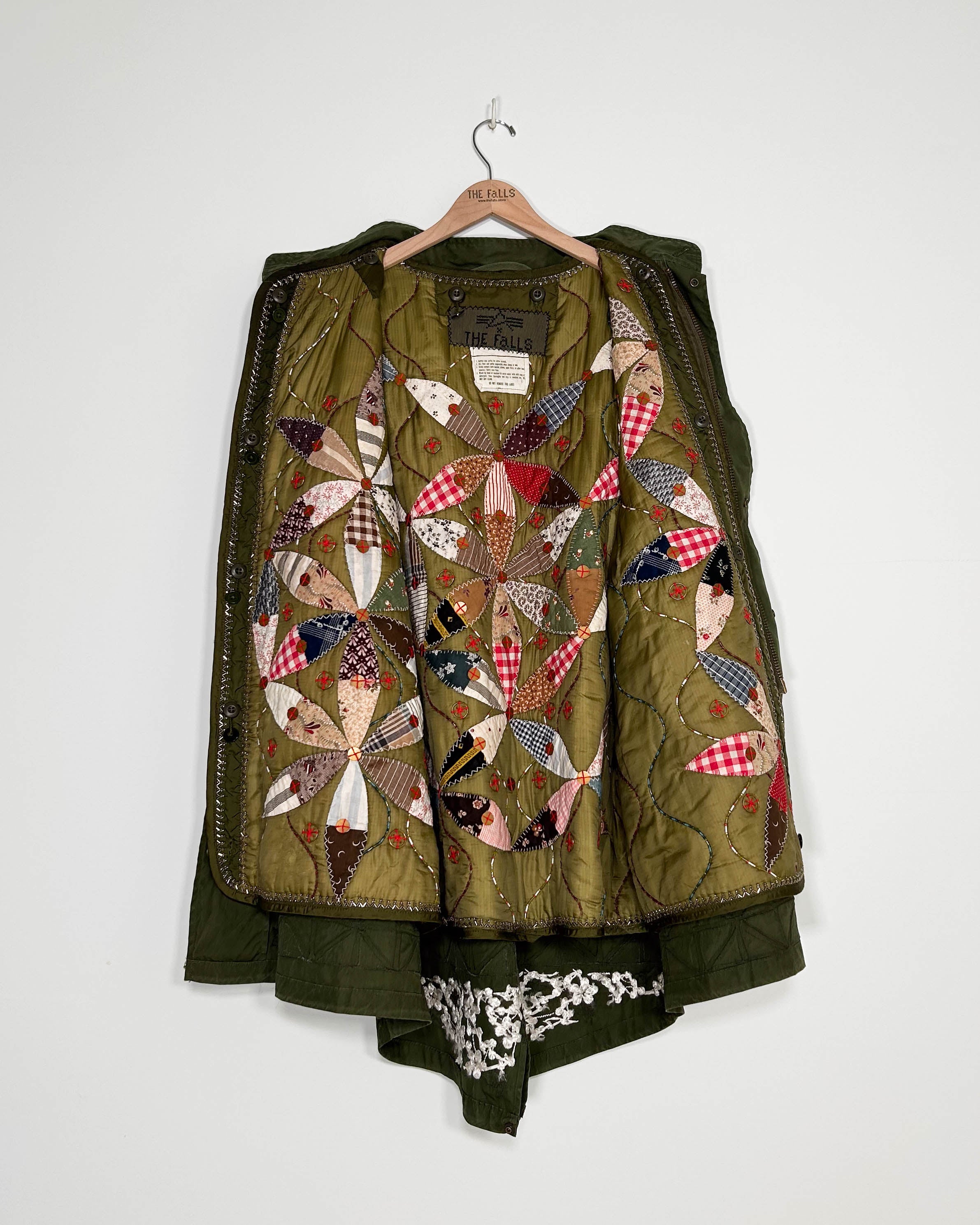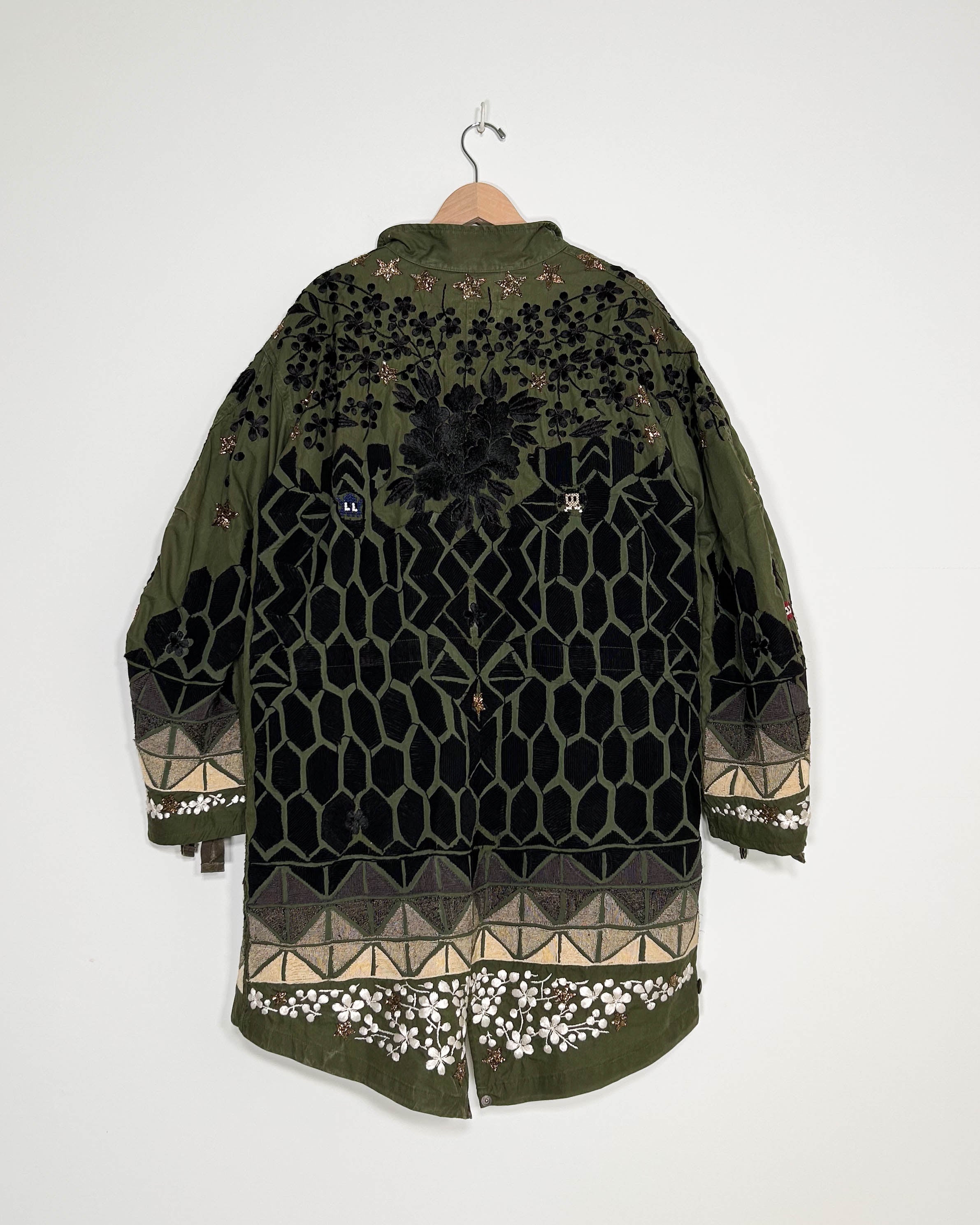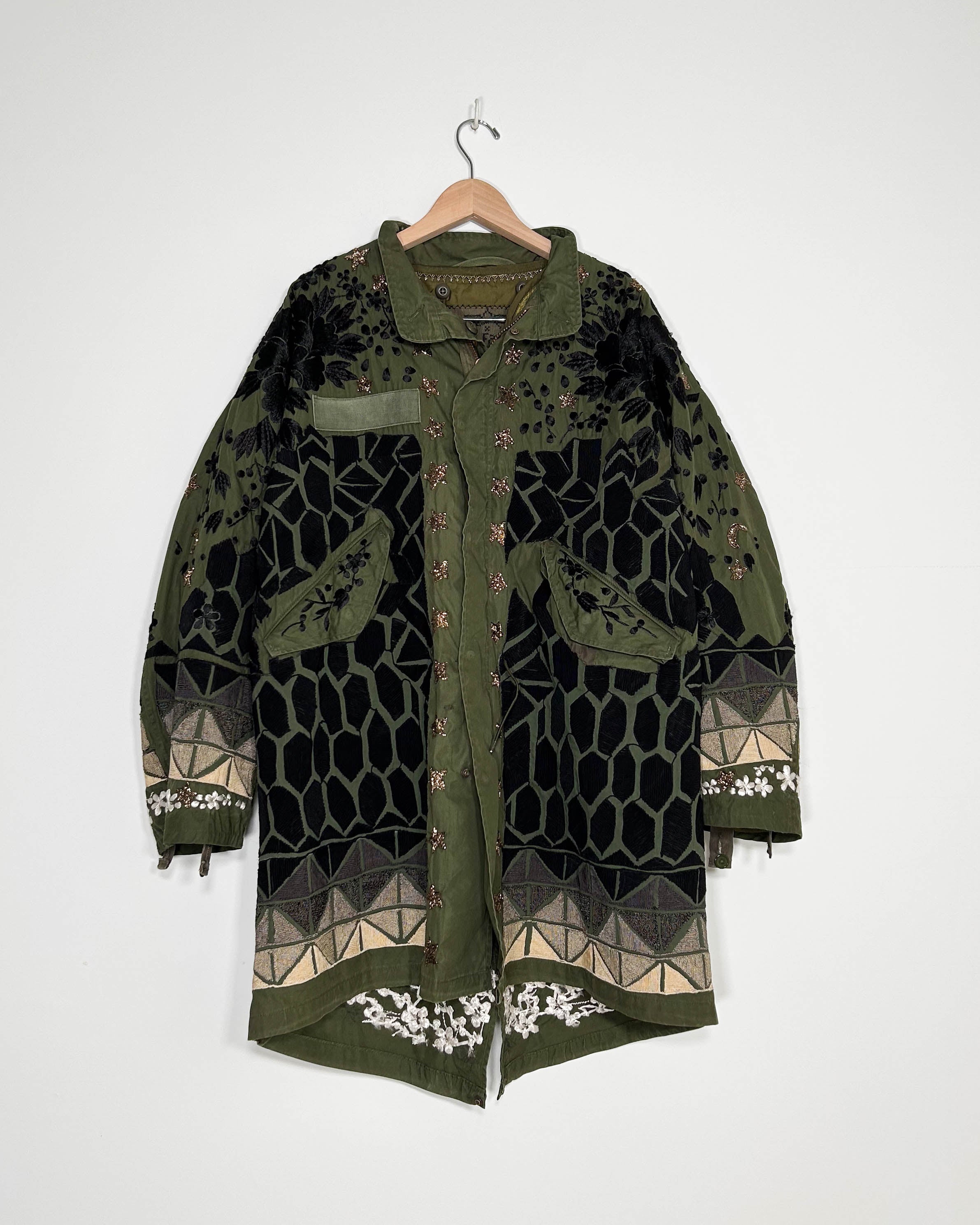 Outer-Heavily repaired Vintage 1960s Army surplus coat with bank collar, heavy industrial zip front with snap closure flap. 2 hip pockets with flaps, lined with wool melton consistent with this style of garment. Drawstring waist, and hem. Geo Corde embroidery inspired by a ruined 19thc overcoat with ombre corde embroidery. The Falls added signature florals, emojis and beaded accents throughout, including glass beaded stars, “ghosts” and asian inspired flowers.