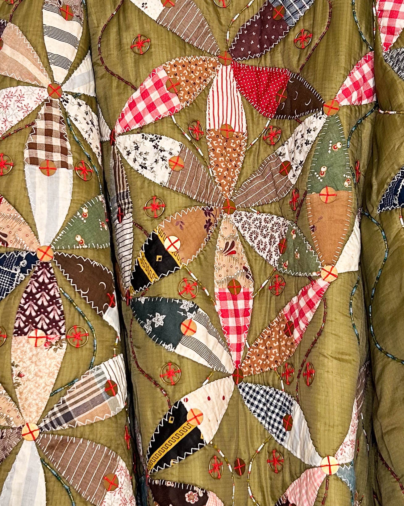 Inner “beach ball” embellished liner, with brass hoop accents, glass beading along seams and re-worked 1950’s found patchwork squares and added on seam pockets. “Beach ball” giant patchwork motifs on the original quilted liner, which can be worn alone or with the outer coat. It took over 1500 hrs of hand work completed this piece.